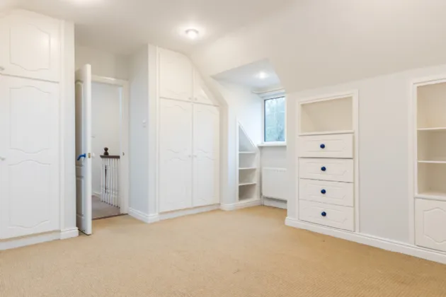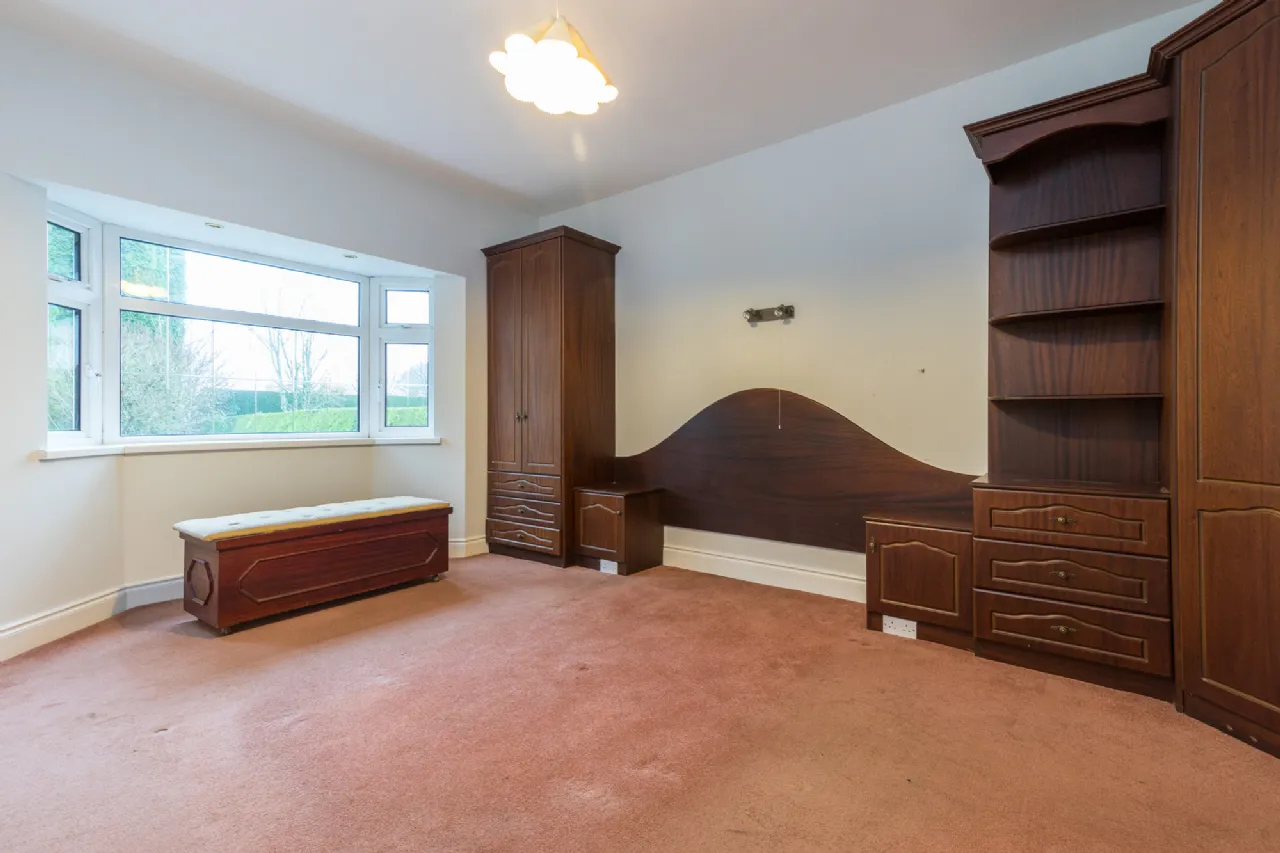 Bedroom 5.20 x 3.67m at widest point carpet flooring, built-in storage units, feature bay window.