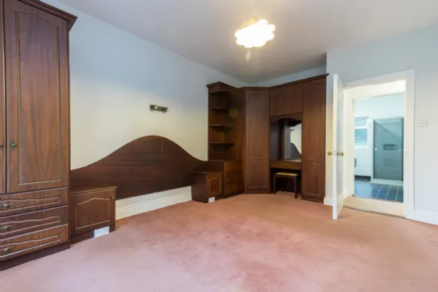 Bedroom 1 4.30m x 4.61m at widest point carpet flooring, built-in wardrobes and storage units.