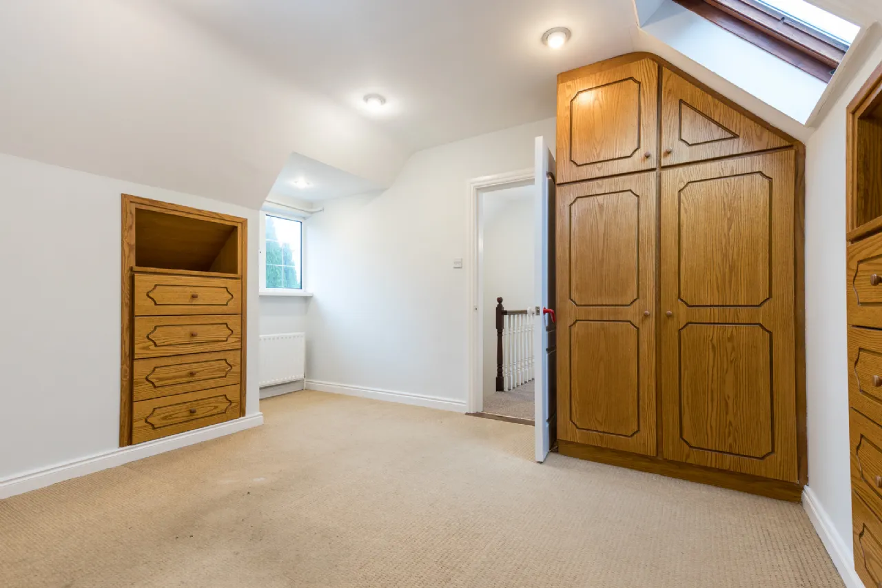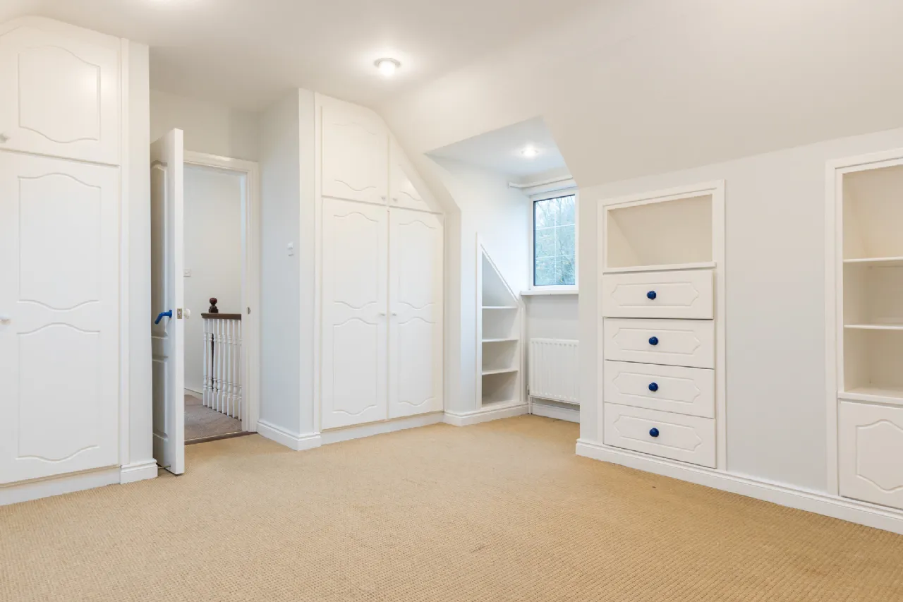 Bedroom 2 4.30m x 3.68m at widest point carpet flooring, built-in wardrobes and storage units.