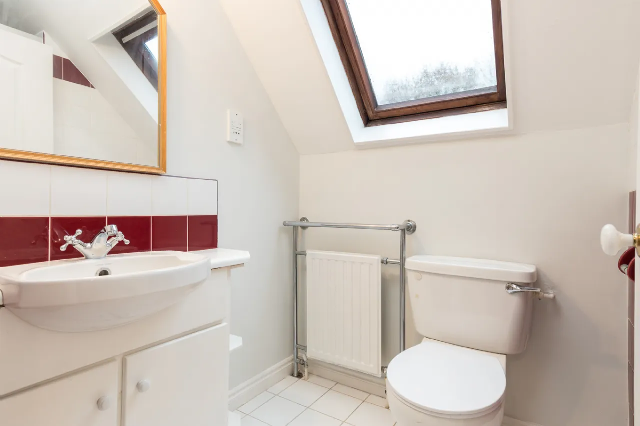 Bathroom 1.50m x 1.18m tile flooring and shower, WC, wash hand basin, heated towel rail.