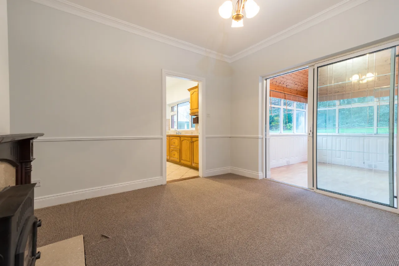 Living Room 3.73m x 3.66m, carpet flooring feature fireplace with inset stove, double glass sliding doors to sunroom.