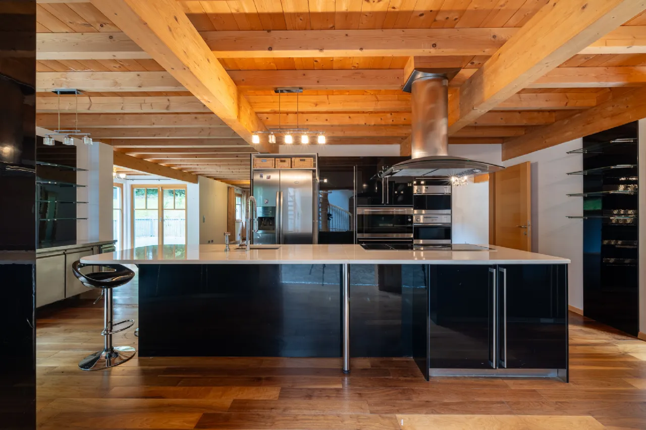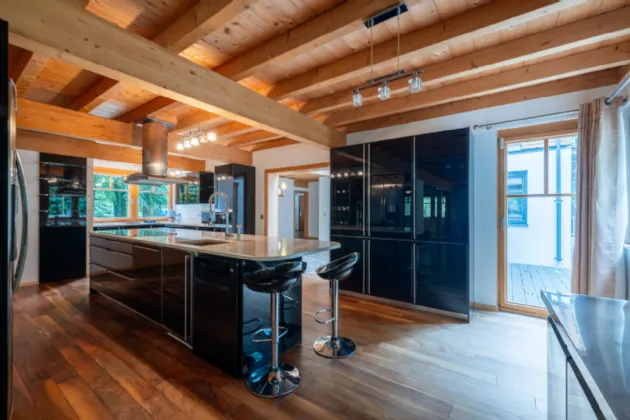 Kitchen/Dining 8.88m x 4.49m at widest point solid wood flooring, fitted kitchen units with matching island and breakfast bar, Americans style fridge freezer, electric ovens, electric hob, exposed timber beams