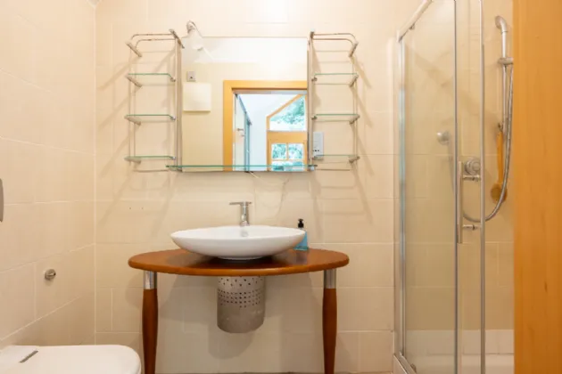 Bathroom 2.25m x 4.54m tile flooring and walls, bath, shower, WC, wash hand basin