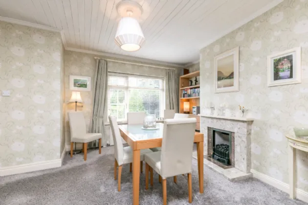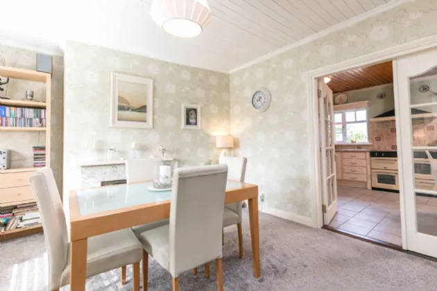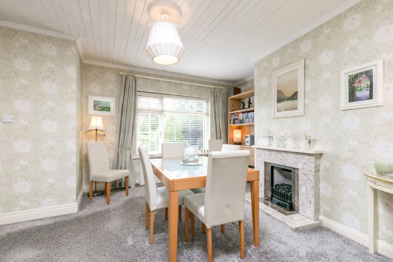 Dining Room 4.10m x 4.49m at widest point, carpet flooring, feature open fireplace, double doors to kitchen.