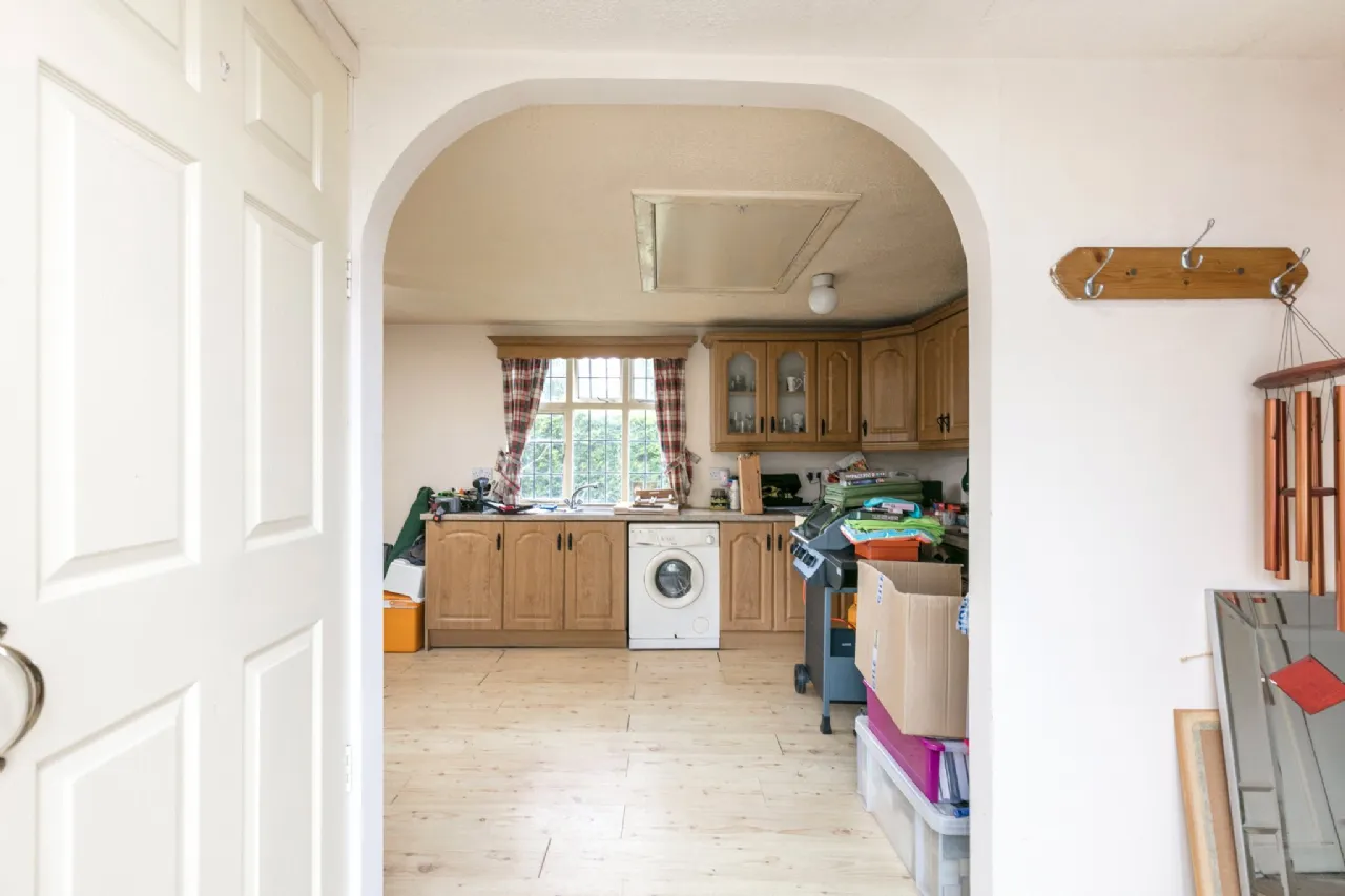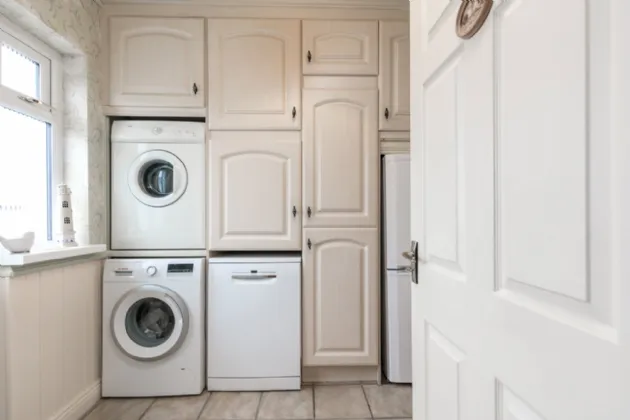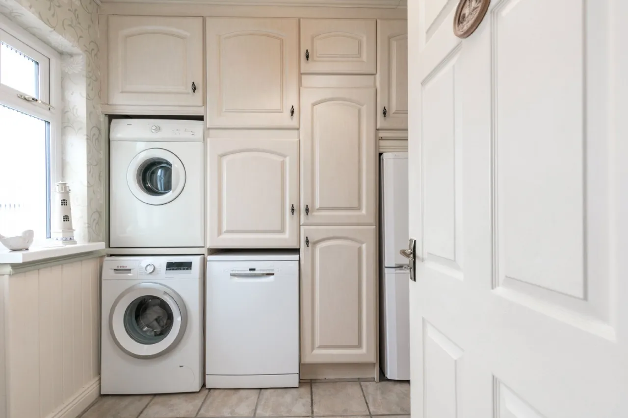 Utility Room 2.46m x 2.38m tile flooring, fitted storage units, plumbed for washing machine and dryer, fridge freezer, dishwasher.