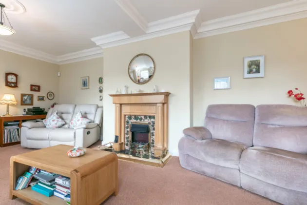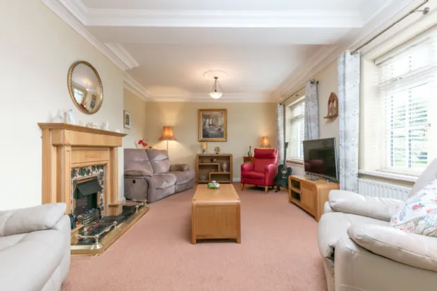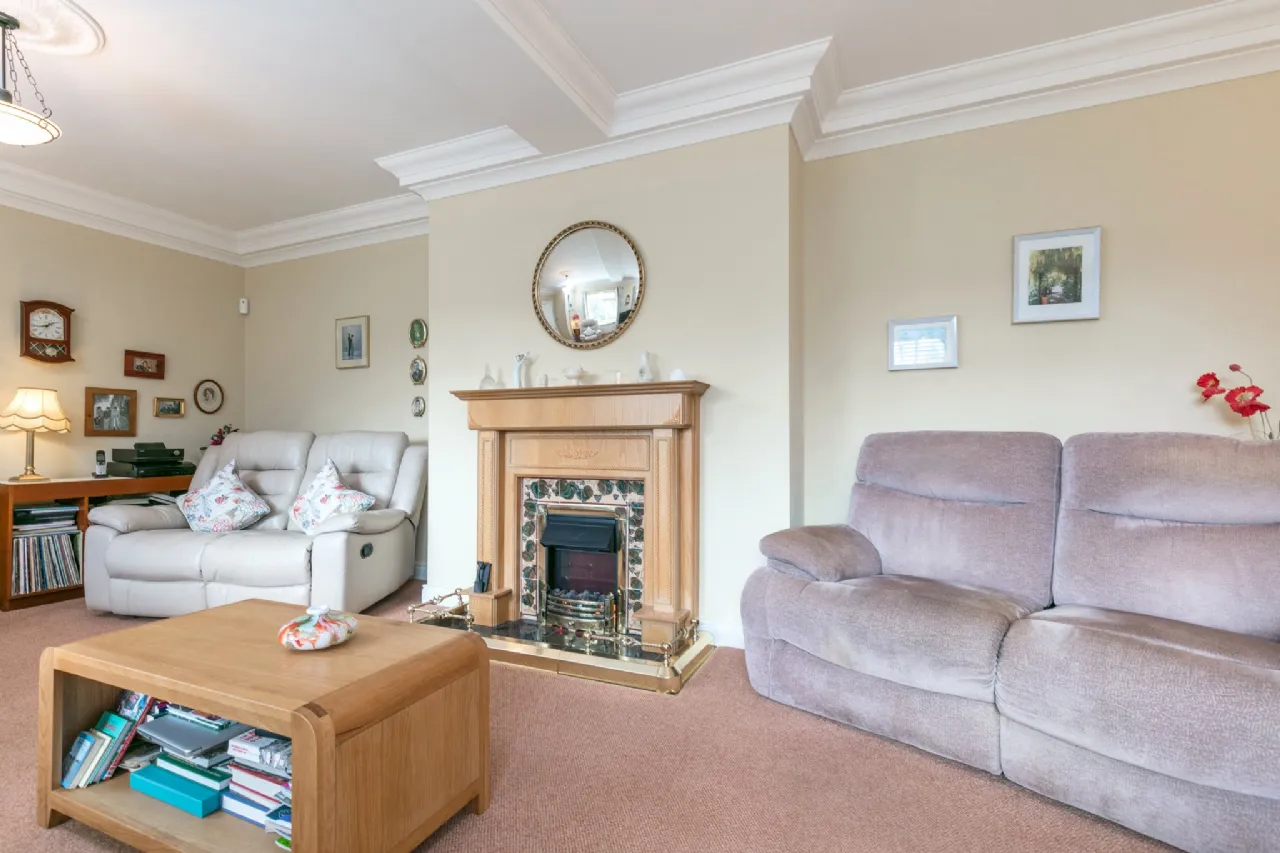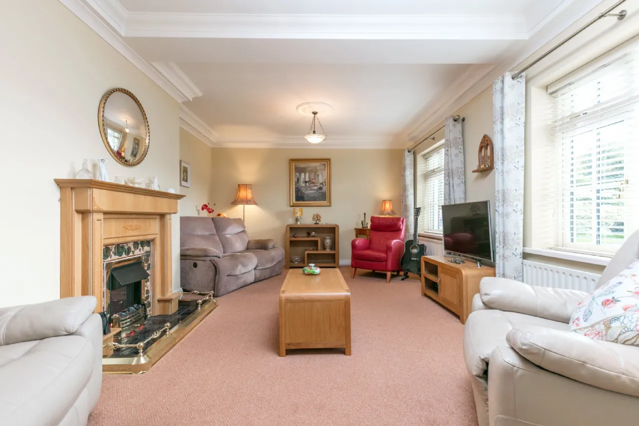 Living Room 4.01m x 7.01m at widest point, carpet flooring, feature fireplace with timber surround.