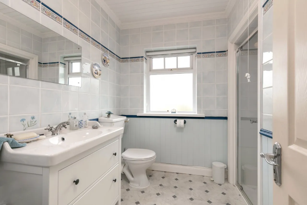 En-Suite 2.46m x 2.79m at widest point, linoleum flooring, timber clad and tiled walls, shower, WC, wash hand basin.