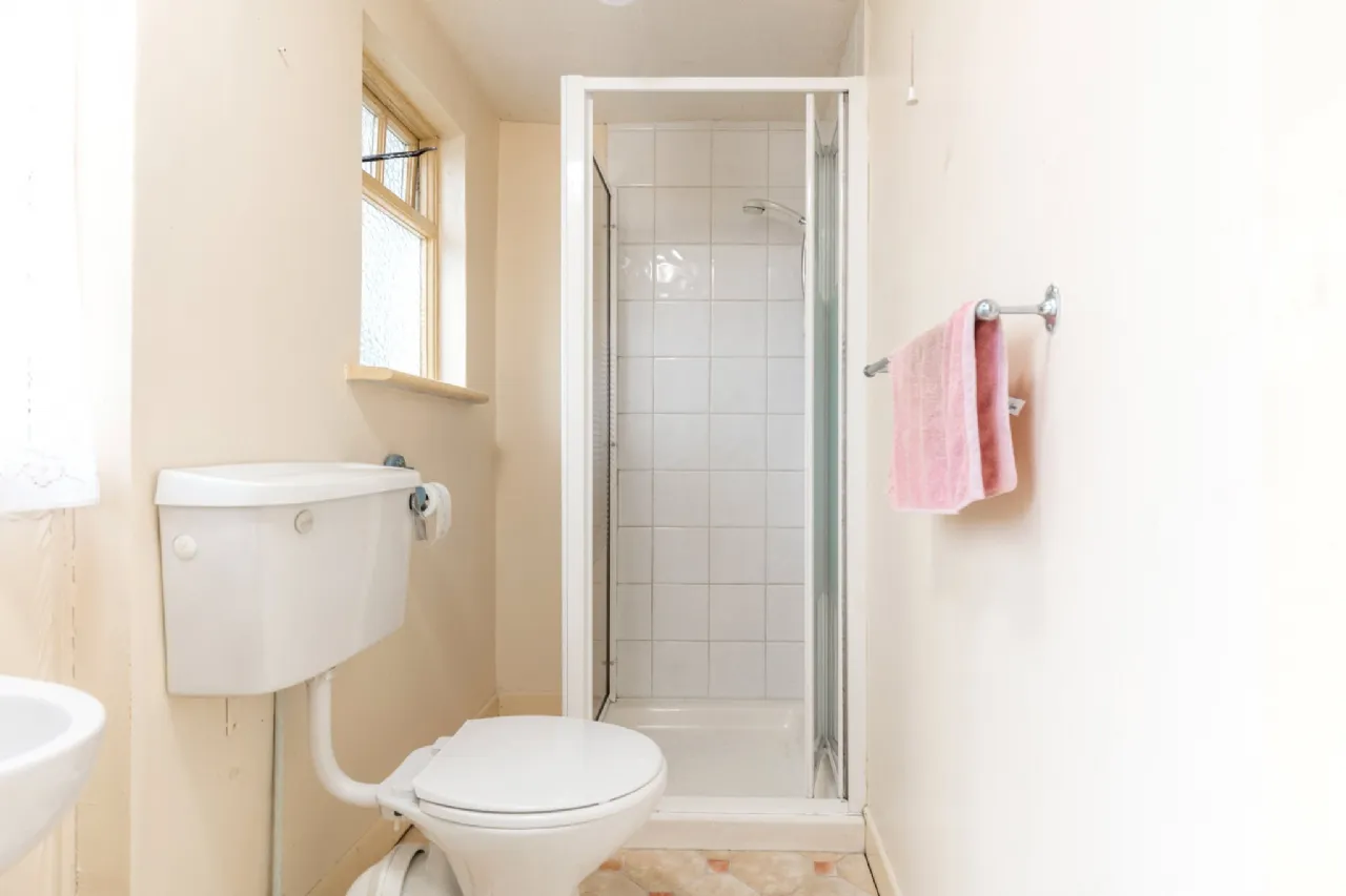 Bathroom 1.28m x 2.10m linoleum flooring, tile shower, shower, WC, wash hand basin.