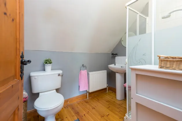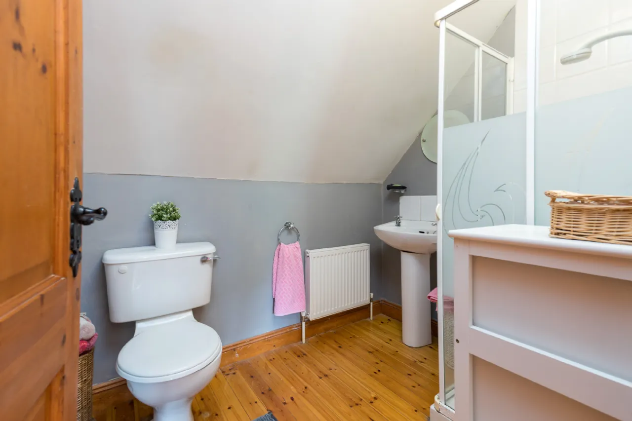 Ensuite 1.80m x 2.26m solid wood flooring, tiled shower, WC and wash hand basin.