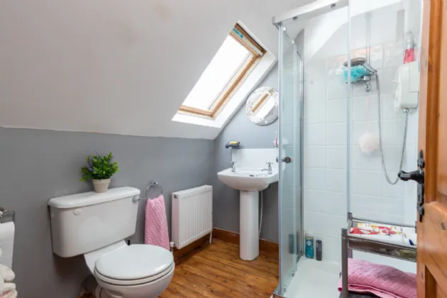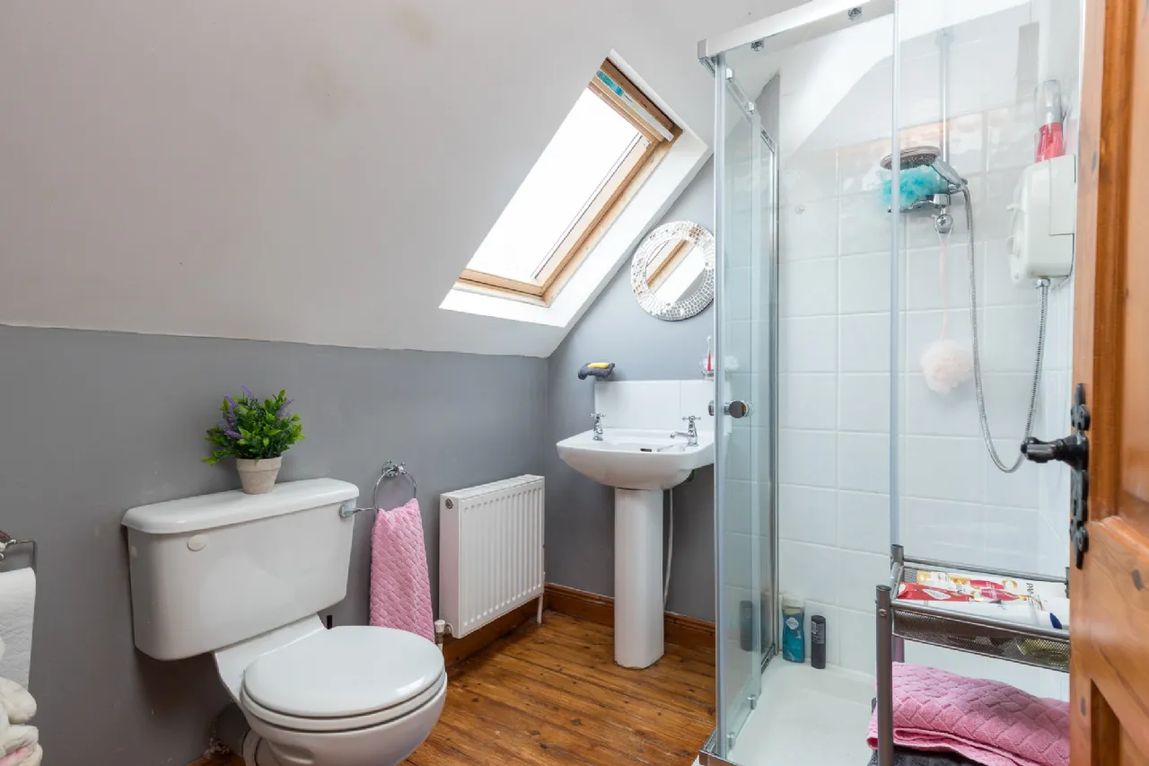 Bathroom 1.80m x 2.04m solid wood flooring, tiled shower, WC, wash hand basin and Velux window.