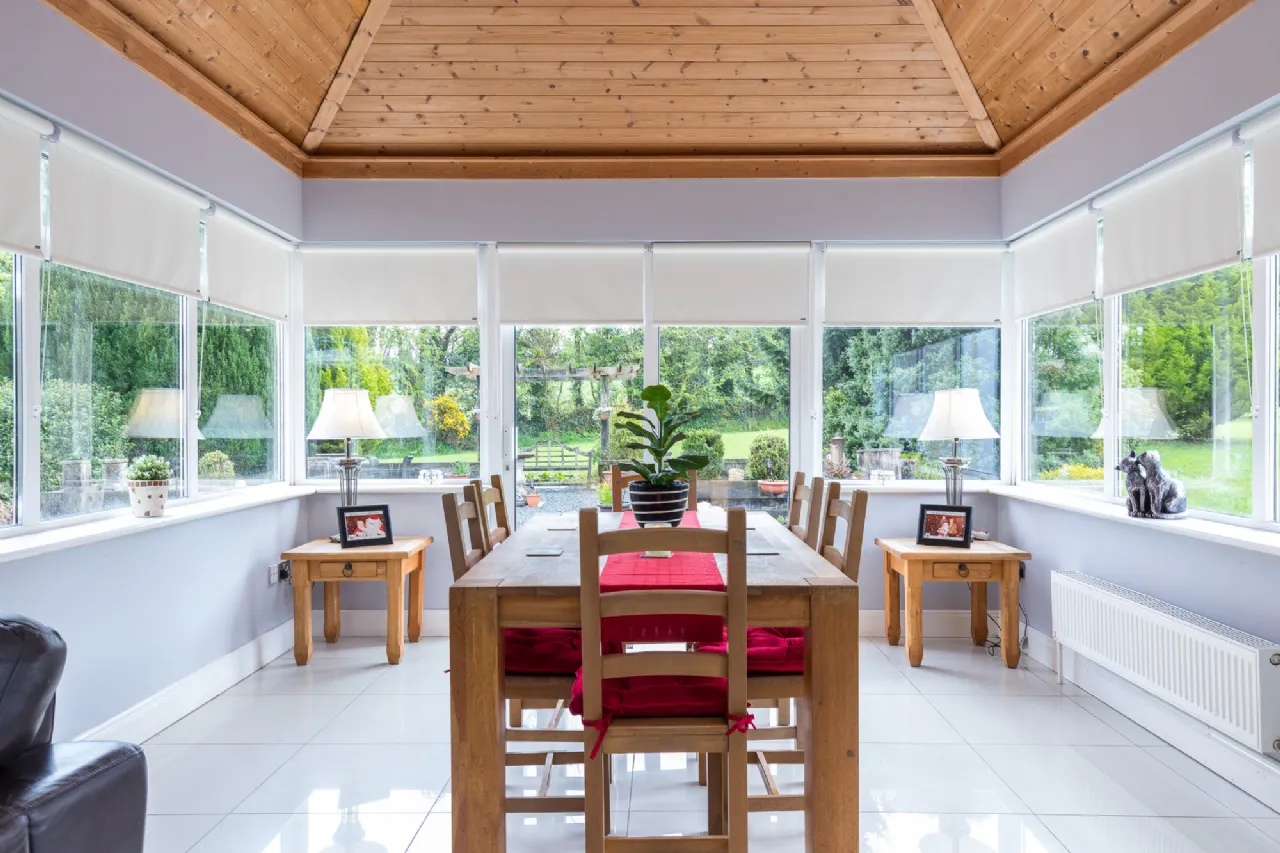 Sunroom 3.77m x 3.00m tiled flooring, vaulted timberclad ceiling and sliding doors to side garden.