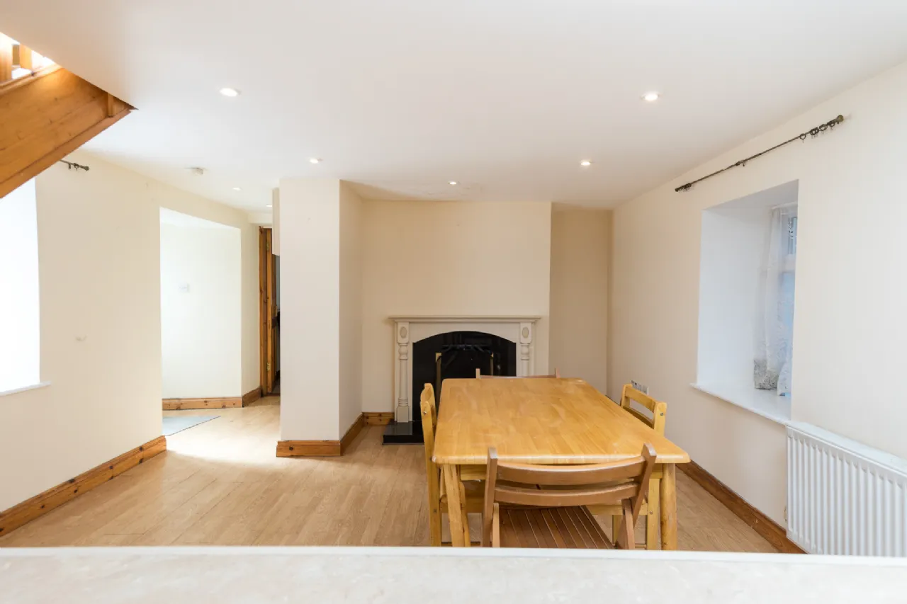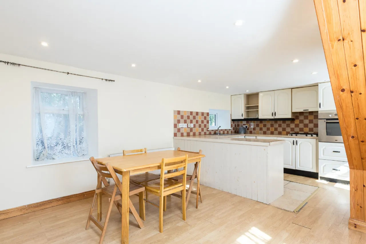 Kitchen/Dining 3.82m x 6.92m at widest point kitchen: tile flooring, fitted kitchen units, electric oven, gas hob, dining: laminate wood flooring, feature open fireplace