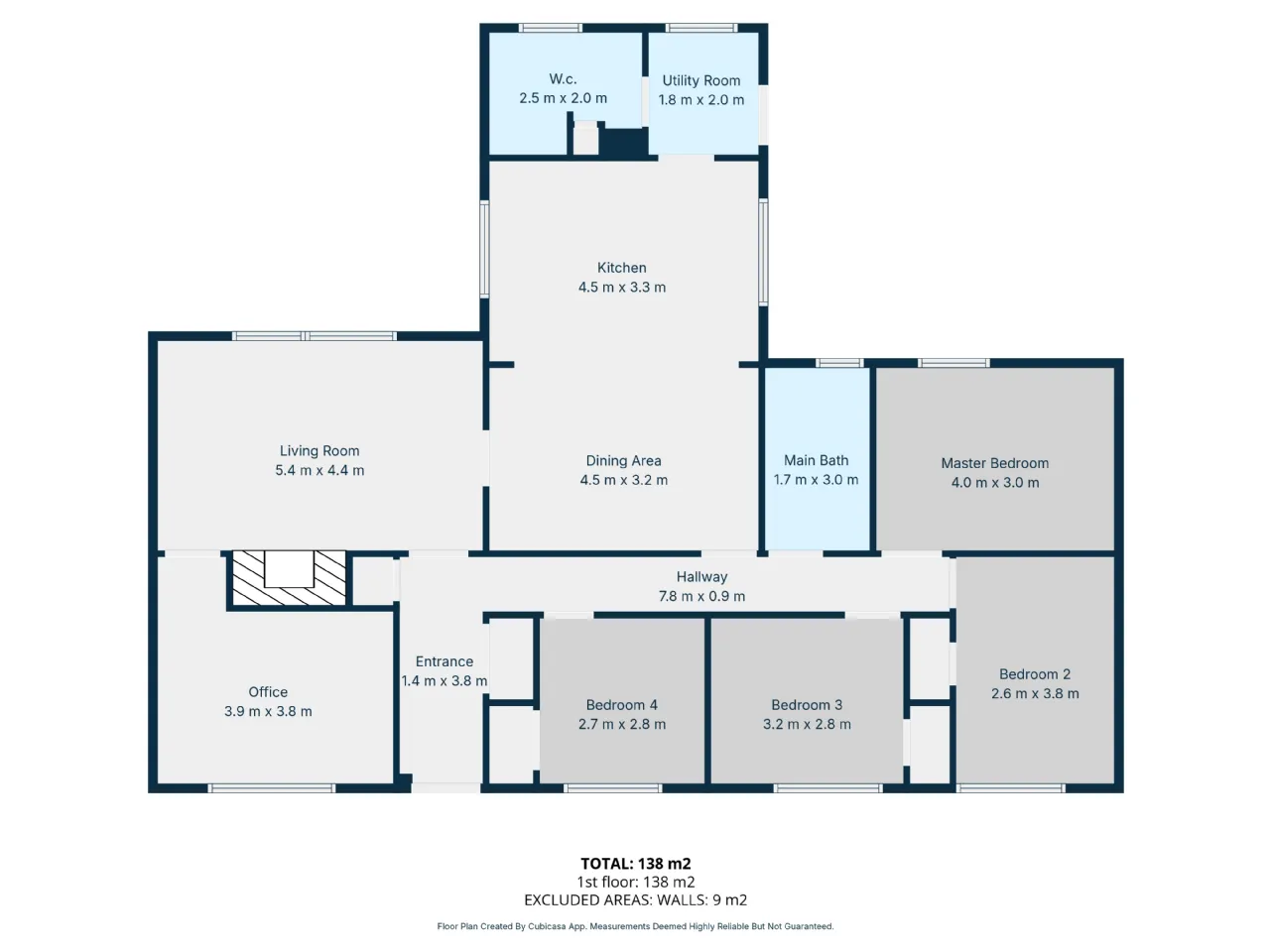 Extending to approximately 138 sqm., the accommodation is thoughtfully laid out and comprises an entrance hallway, spacious living room, home office, open-plan kitchen/dining area, utility, guest W.C., four bedrooms and a family bathroom.