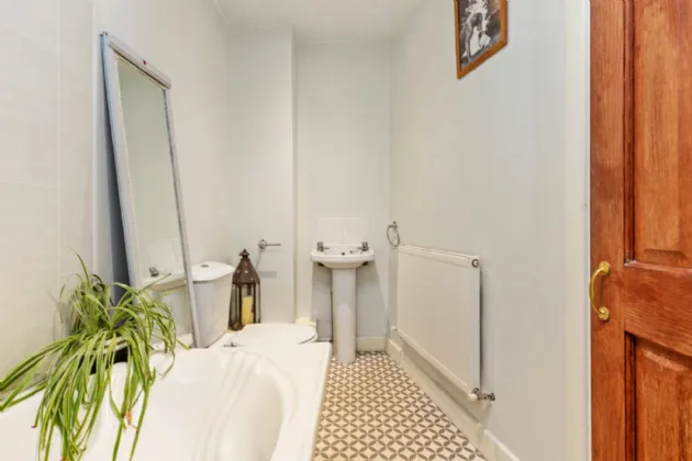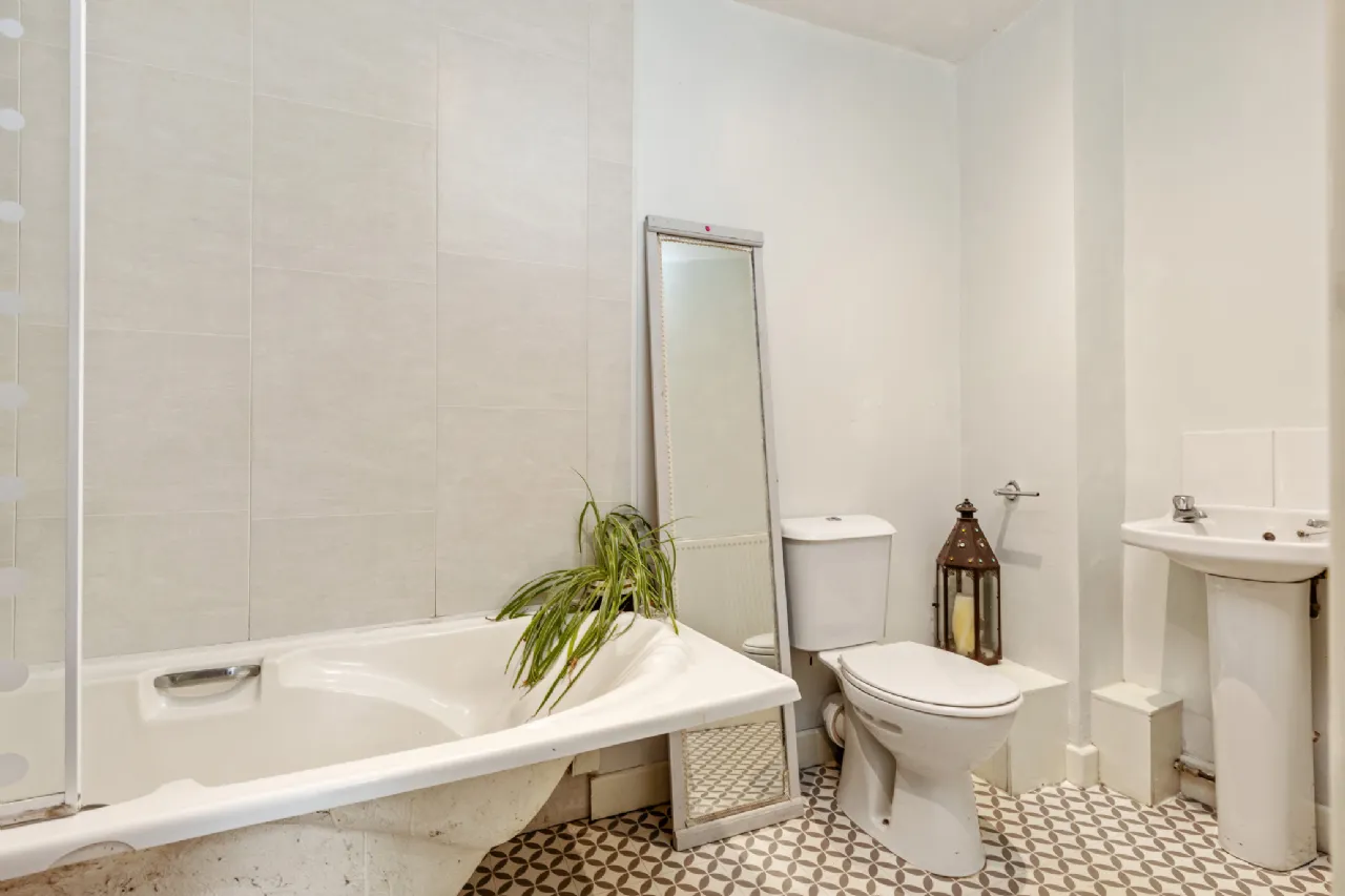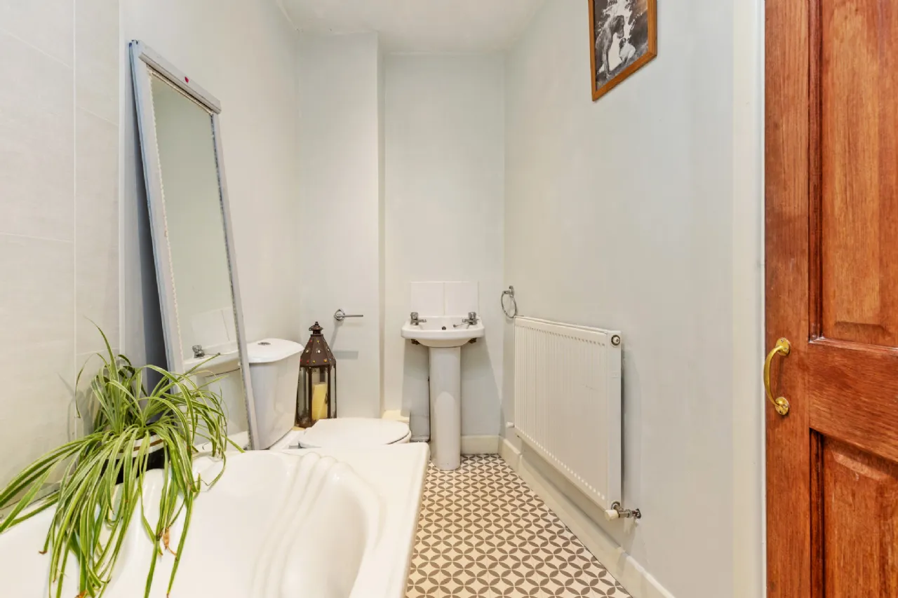 Bathroom 3.1m x 1.5m with tiled flooring, tiled shower surround and backsplash. Bath with electric shower over, WC and WHB