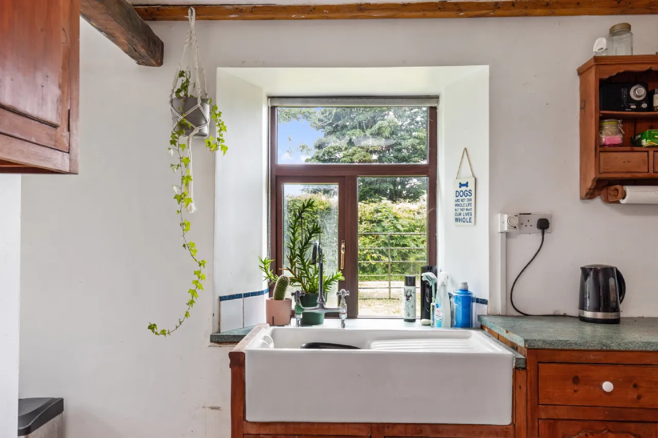 Kitchen 3.6m x 3m tiled flooring, bay window to the front, waist and eye level timber units, Belfast sink, electric cooker and exposed beams (this is the original part of the house)
