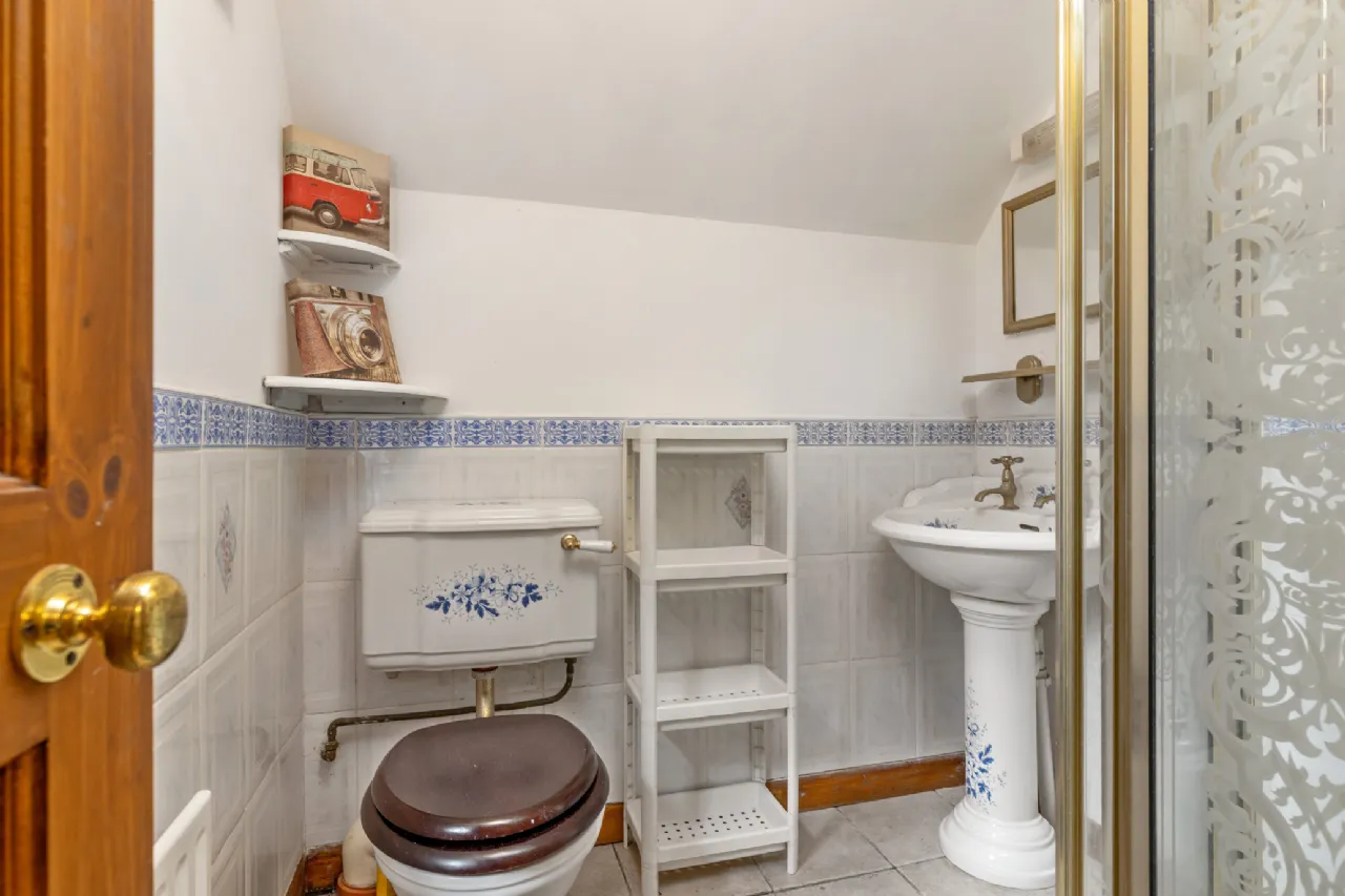 Shower Room 1.7m x 1.5m with tiled flooring and part-tiled walls, WC, WHB and electric shower