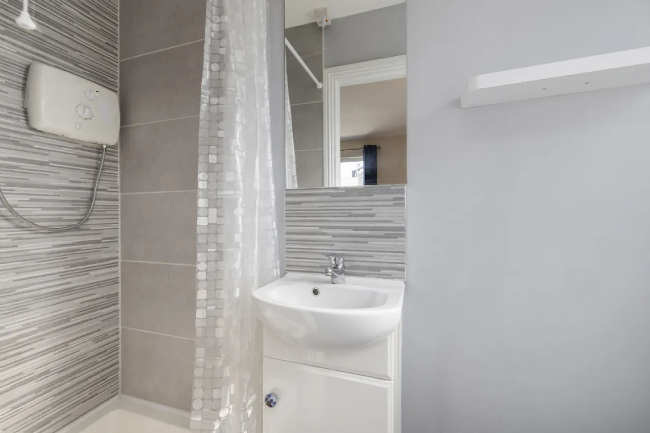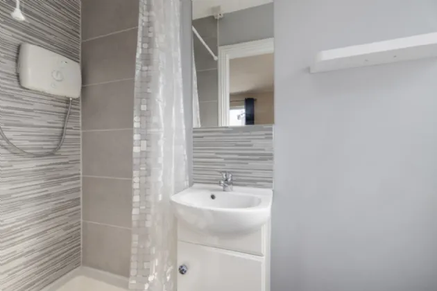 En-Suite With tiled flooring, wash hand basin and shower unit fitted with an electric shower.