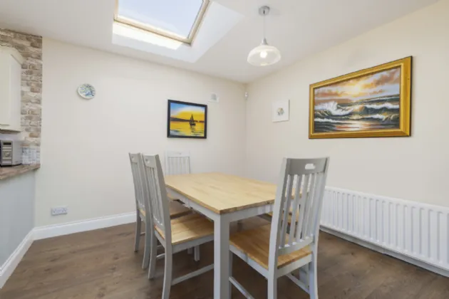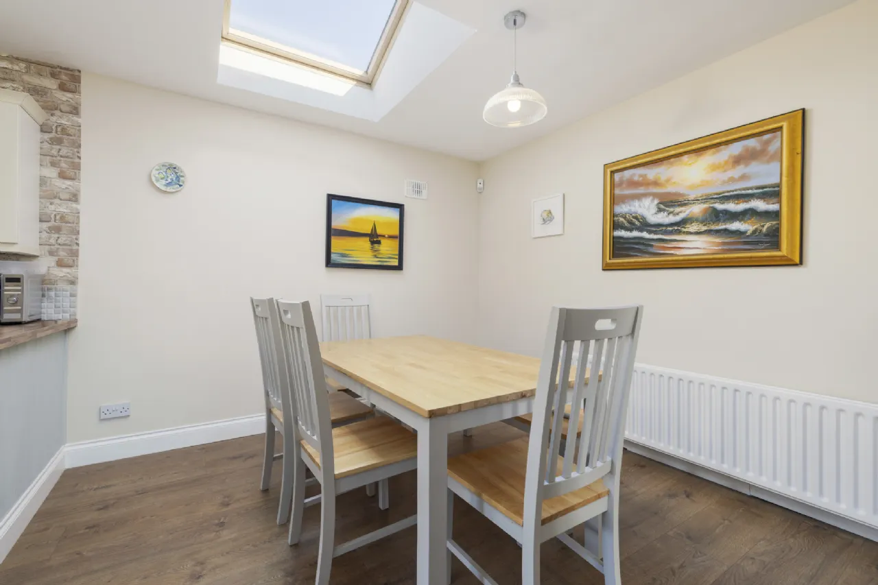 Kitchen Dining Room The bright and stylish kitchen and dining area is designed for both functionality and comfort, featuring timber flooring that flows seamlessly throughout. The modern kitchen is equipped with quality appliances and a convenient breakfast bar, perfect for casual dining or entertaining. Natural light floods the space, with a Velux window enhancing the airy ambiance in the dining area. and access to the garden.