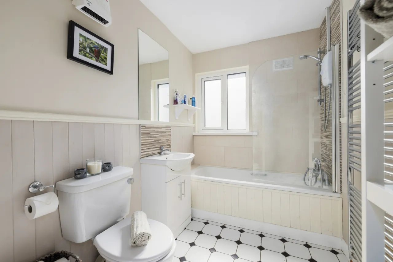 Bathroom Family bathroom complete with tiled flooring, bath with tiled surround and features an electric shower. Wash had basin and WC.