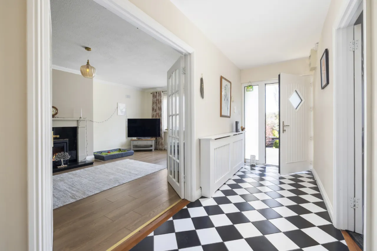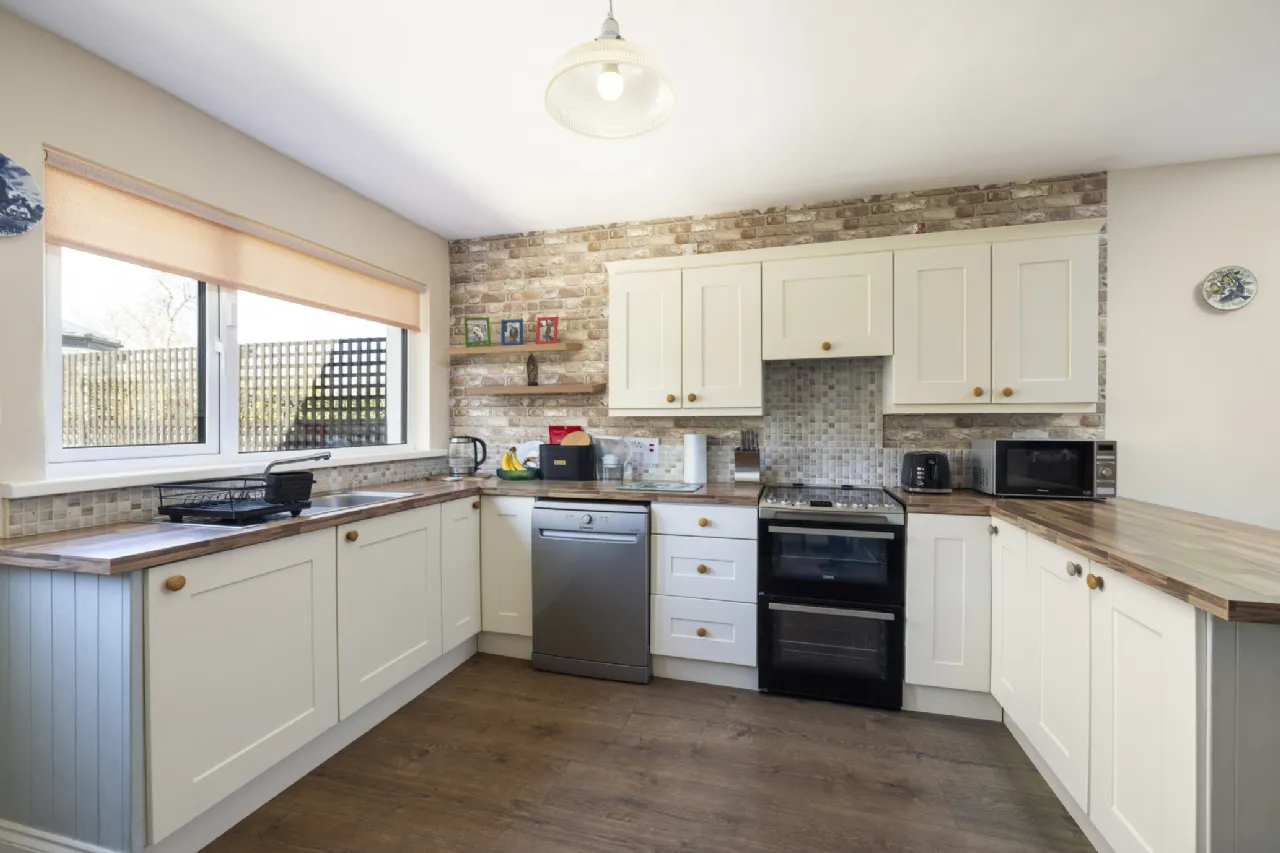Immaculately decorated and beautifully maintained, the home features elegant tiled and timber flooring throughout. The spacious living room is a true highlight - a wonderfully large yet cosy space, complete with a wood-burning stove and picturesque views of the lush green area to the front.