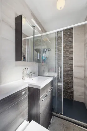 En suite 1.98m x 1.34m Spacious en suite bathroom featuring a fully tiled walk in shower unit with electric shower and tiled flooring. there is a standalone whb with built in storage and a wc also features.