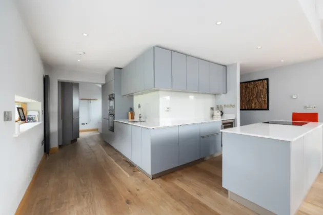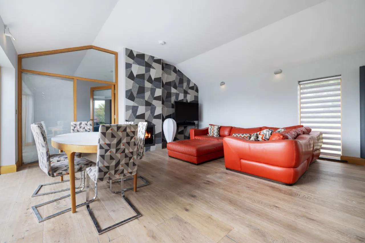 Kitchen/Dining/Living Room 9.27m x 5.73m This impressive room really is the heart of the home with high ceilings and large windows allowing for plenty of natural light. There is an ideally placed wood burning stove for those cosy nights spent indoors and ample space for family dining and entertaining, sliding doors also afford access to the courtyard, the perfect spot for outdoor dining. The sleek and stylish kitchen is well equipped and features and a range of wall and floor units for storage and ample countertop space for food prep. An attractive island provides additional dining space and the engineered wood floors give a warm finish to this super space.