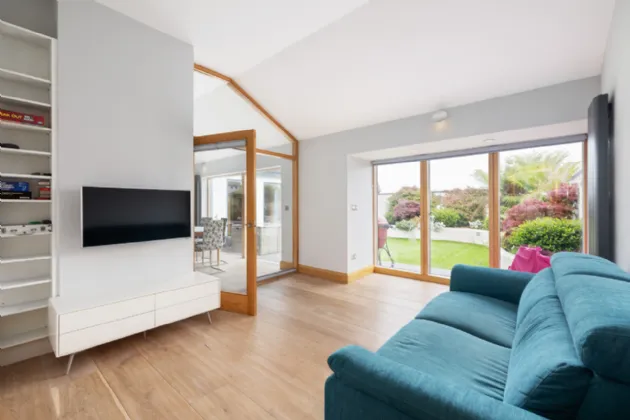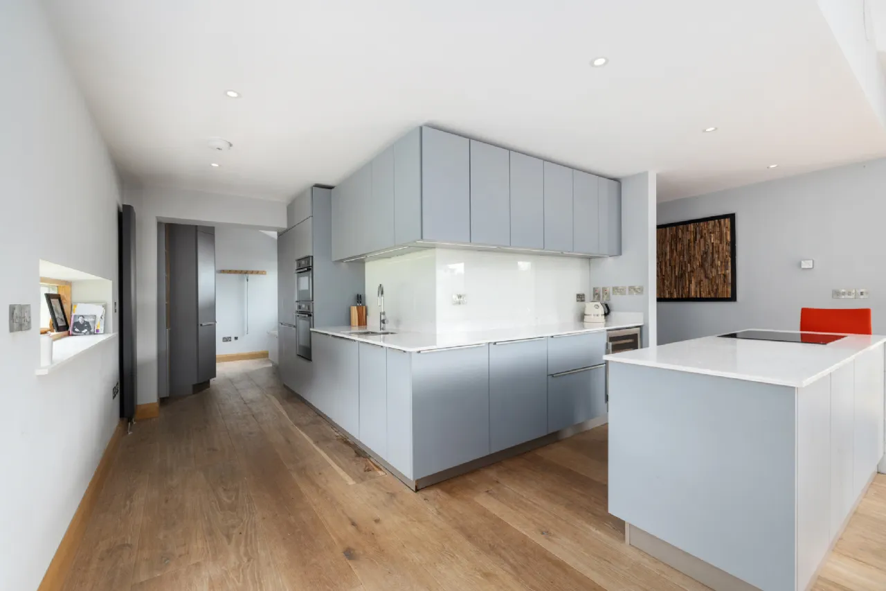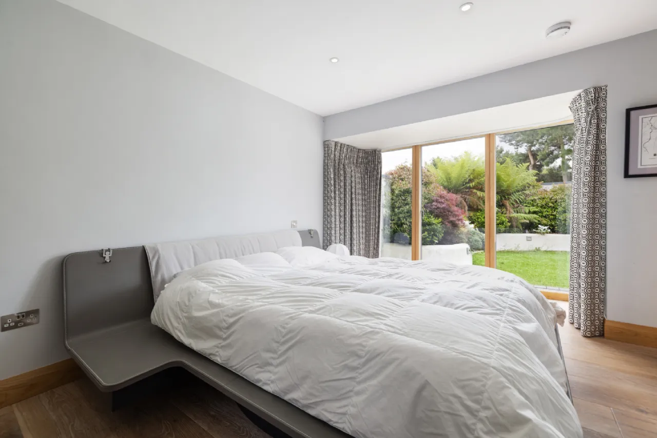 The bespoke, well equipped kitchen provides ample space for dining and all appliances are integrated and high spec. The large, comfortable living room is beautifully decorated with a solid fuel stove for cosy evenings after a day at the beach. Access to the lush landscaped garden is afforded through sliding doors and the floor to ceiling windows along with the high ceilings create a wonderful sense of space and light.