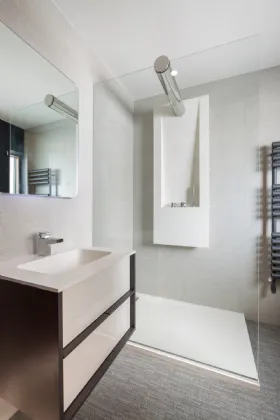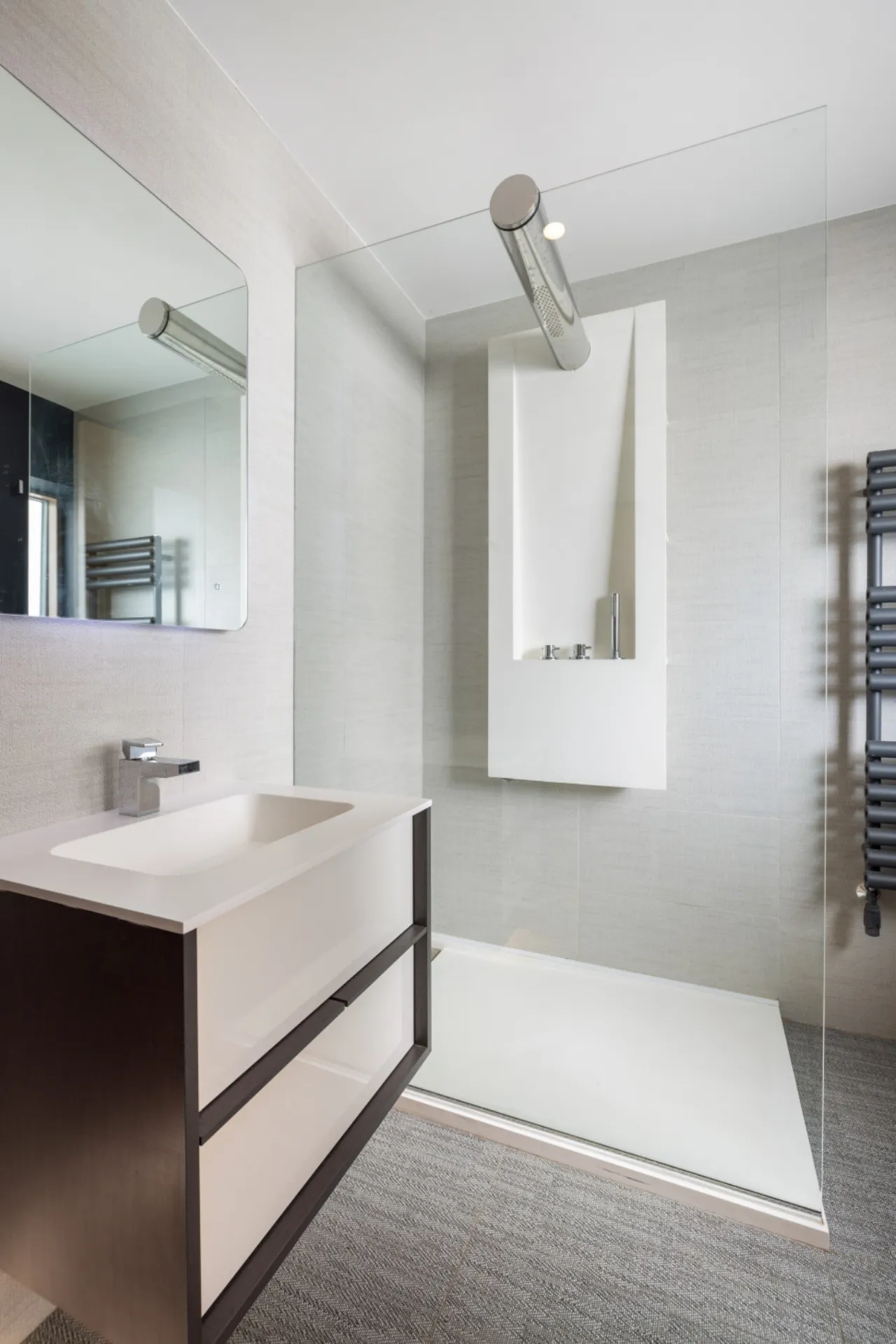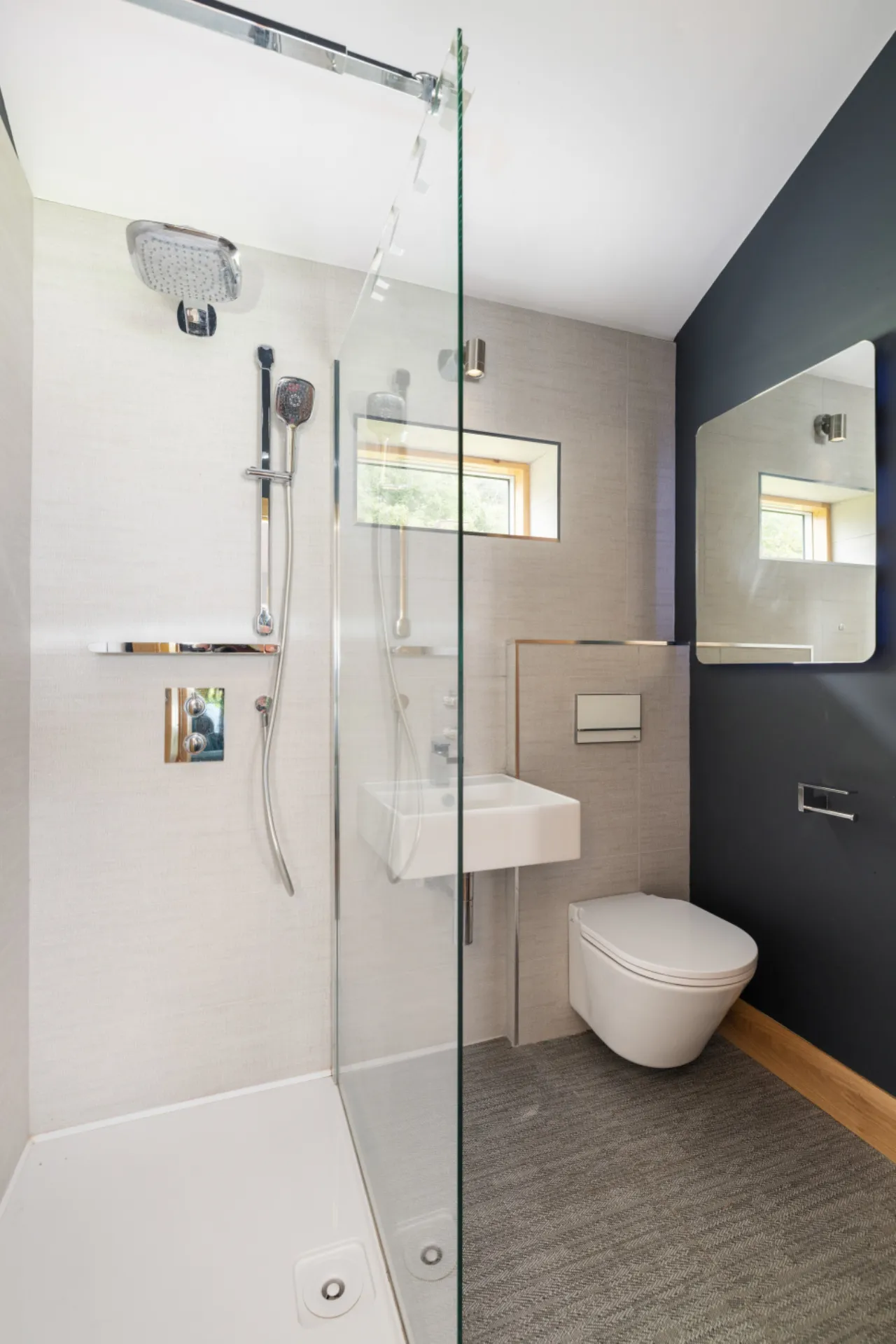 Shower Room 2.18m x 2.20m Stylish shower room boasting high spec bathroom fittings and a large walk in shower. Tastefully tiled and also featuring wc, floating whb and a Smart mirror.