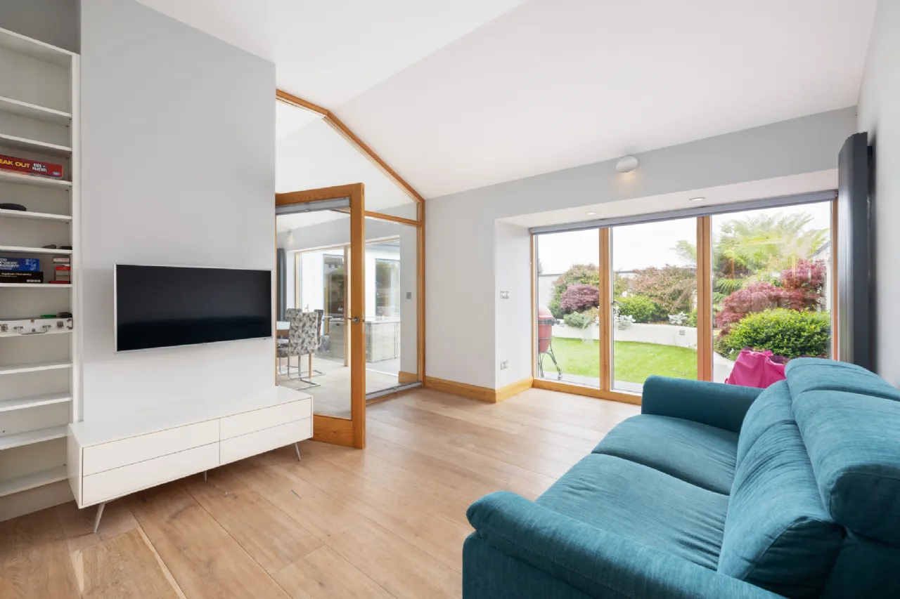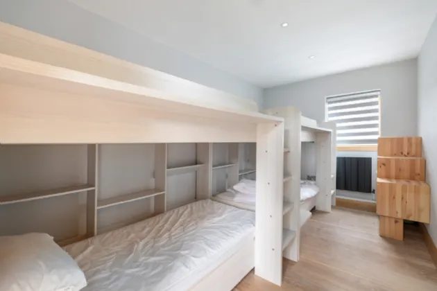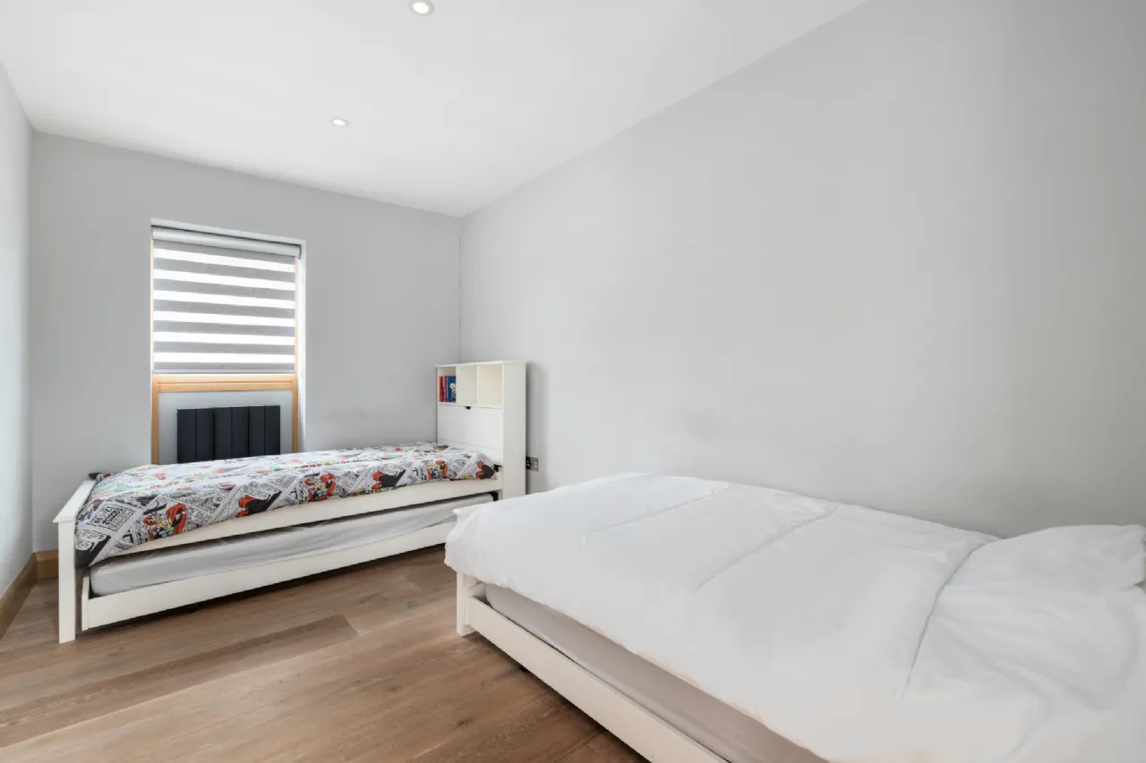 Bedroom 4/Family Room 4.38m x 3.78m Located off the open plan living area this is a spacious double room currently in use as a family room with built in shelving and engineered wood flooring. The floor to ceiling windows allow for plenty of natural light and the high ceiling creates a wonderful sense of space.