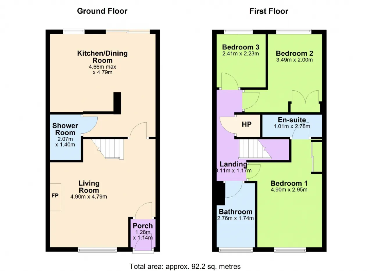 Bedroom 1 4.90m x 2.95m The master bedroom is positioned to the front and includes an ensuite with WC, wash-hand basin, and shower cubicle.