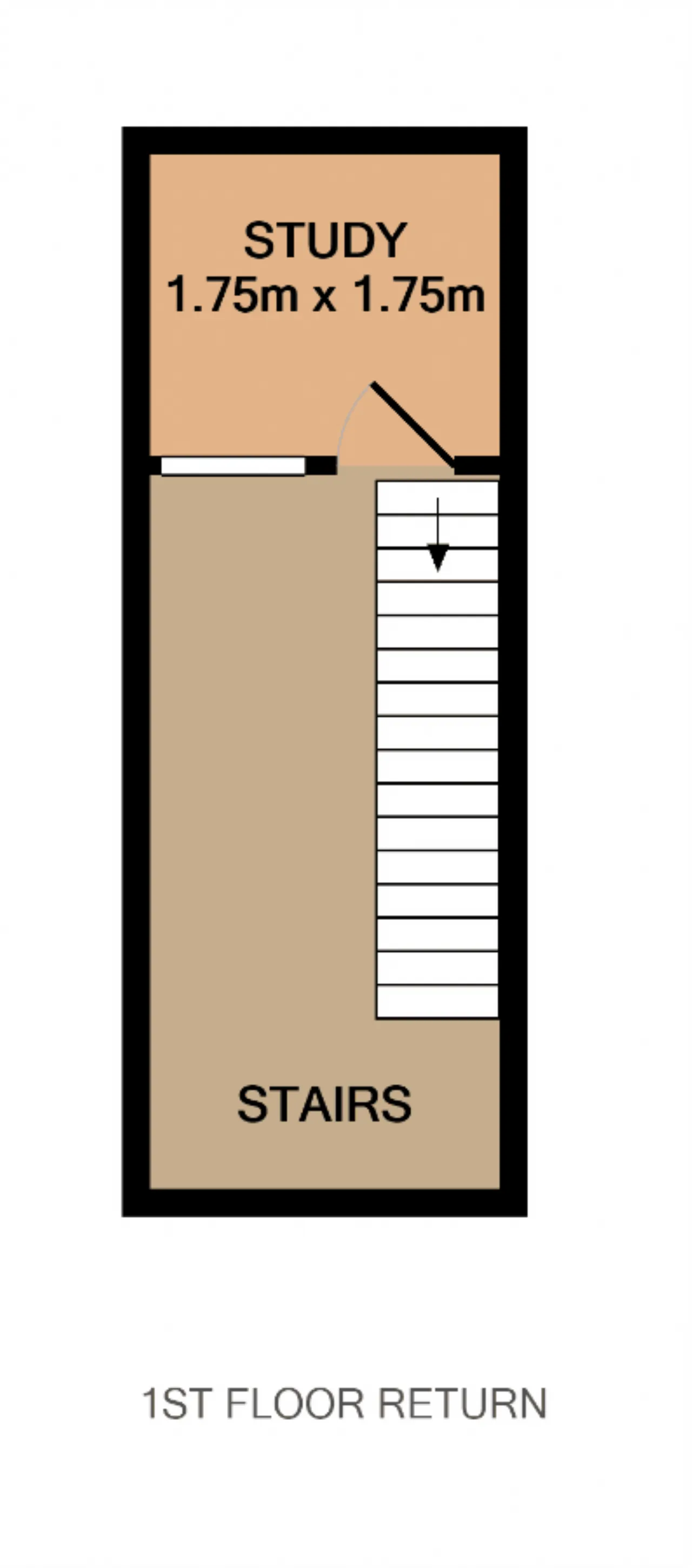 Study 1.75m x 1.75m Situated at the top of the stairs above the half landing, it is an ideal area for a study with wooden floors, recessed lights, storage cupboard and shelves.