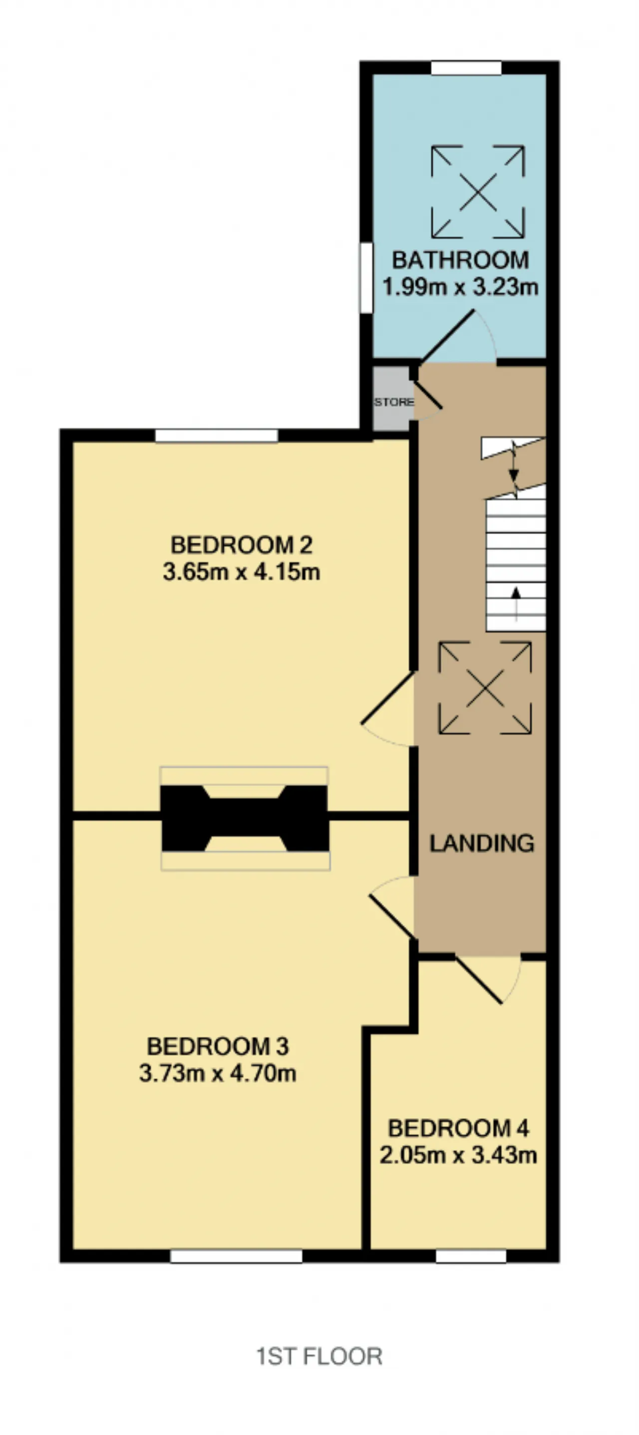 Bedroom 4 2.05m x 3.43m A nice single bedroom at the front of the house with carpet floors, a retro metal radiator and window blinds.