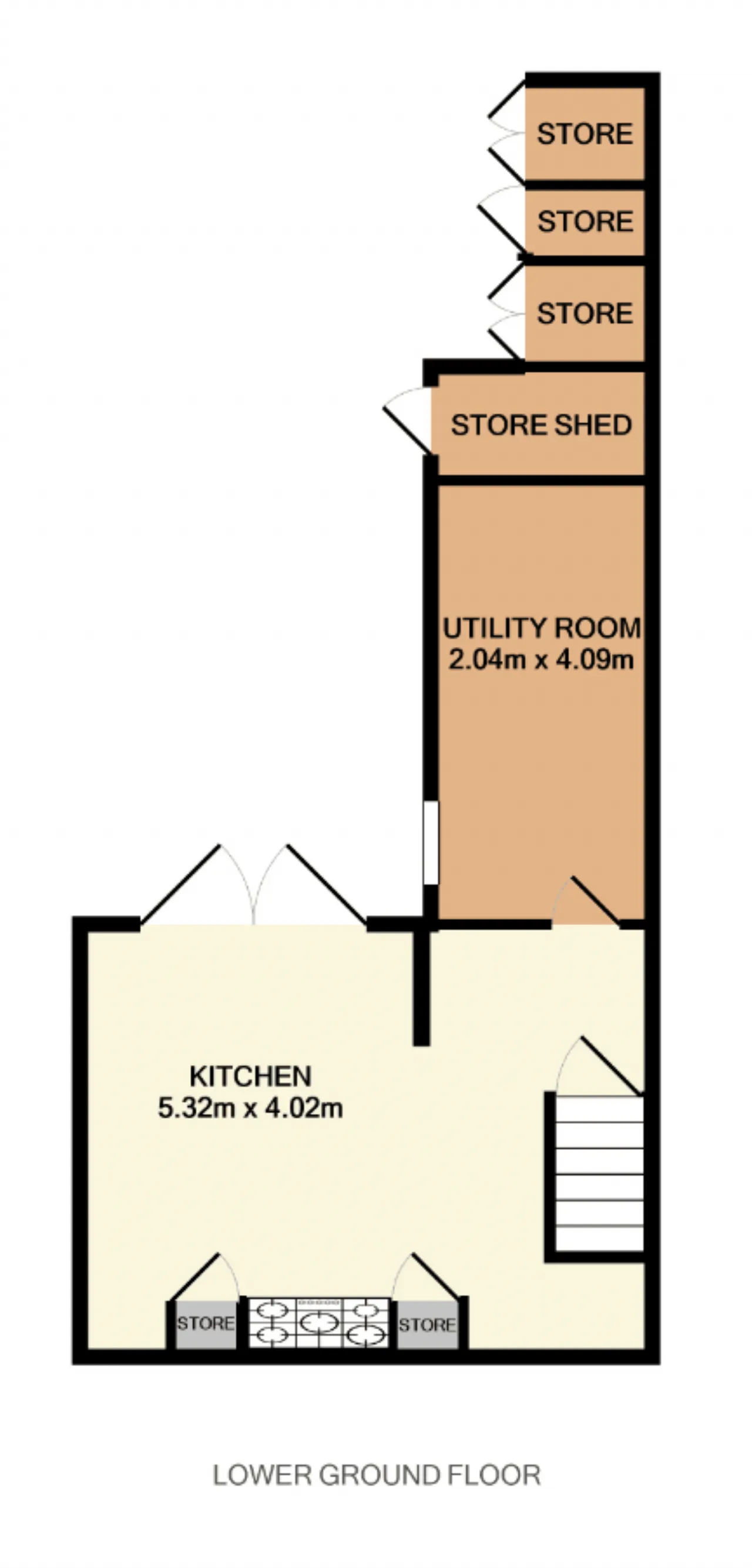 Kitchen / Diner 5.32m x 4.02m Located on the lower ground floor this is a large open plan room with a modern shaker style kitchen, black granite worktops, under floor heating, recessed ceiling lights and under unit worktop lighting, black tiled floor, 1,100mm dual fuel Stoves range with tiled splashback, integrated Zanussi dishwasher, stainless steel sink and ceiling coving. French double doors lead out to the courtyard patio which is ideal for ‘al fresco’ dining, whilst another internal door leads into….