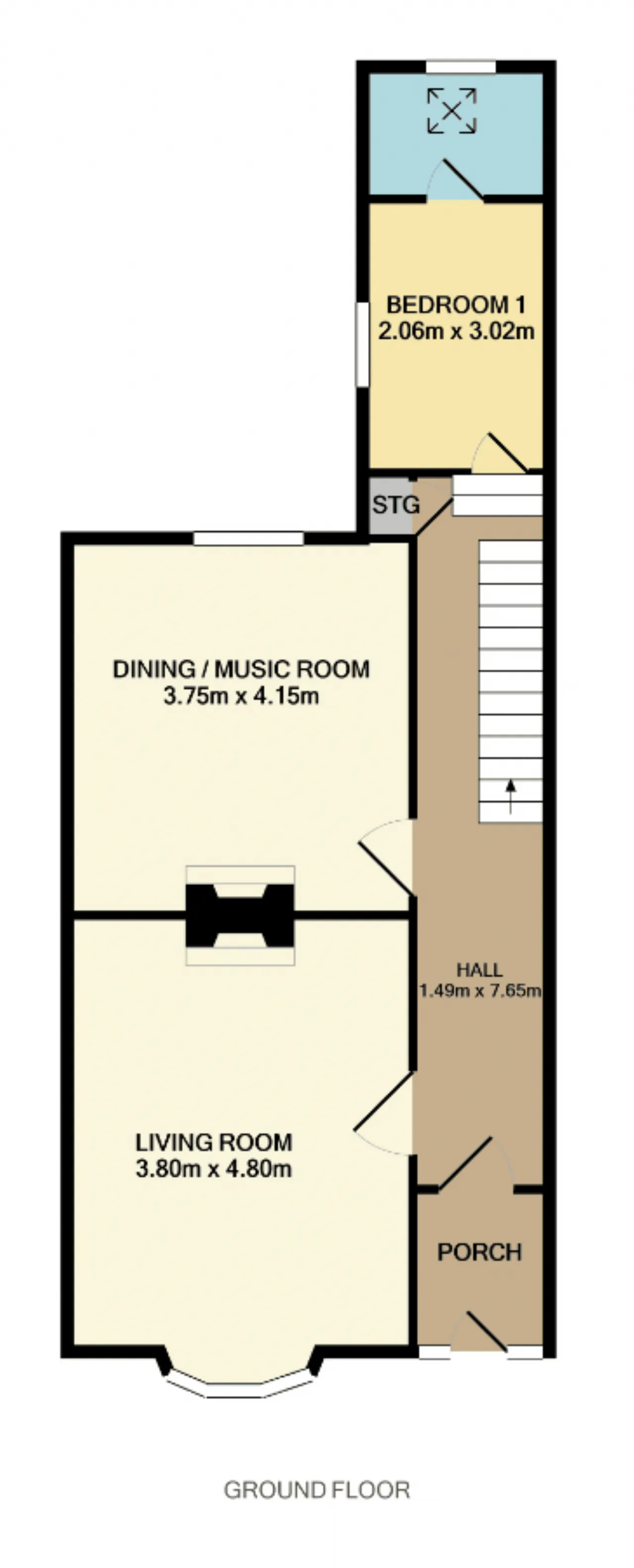 Living Room 3.80m x 4.80m A bright and large front reception room with high ceiling, a bay window, ceiling coving and a centre rose, wooden floors, an open cast iron fireplace, two metal radiators and window blinds.