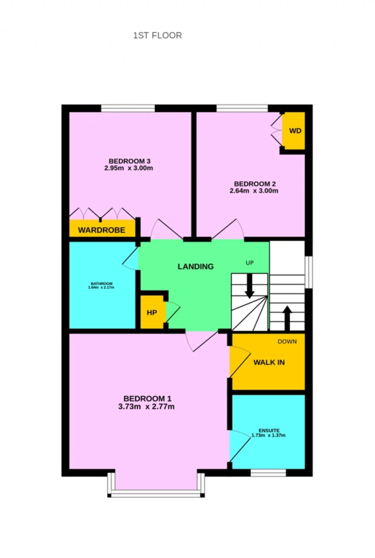 Bedroom 1 3.73m x 2.77m A bright and airy principal bedroom suite located at the front of the house with engineered wood effect flooring, a box bay window, a walk in wardrobe with fitted shelves and rails and an ensuite shower room