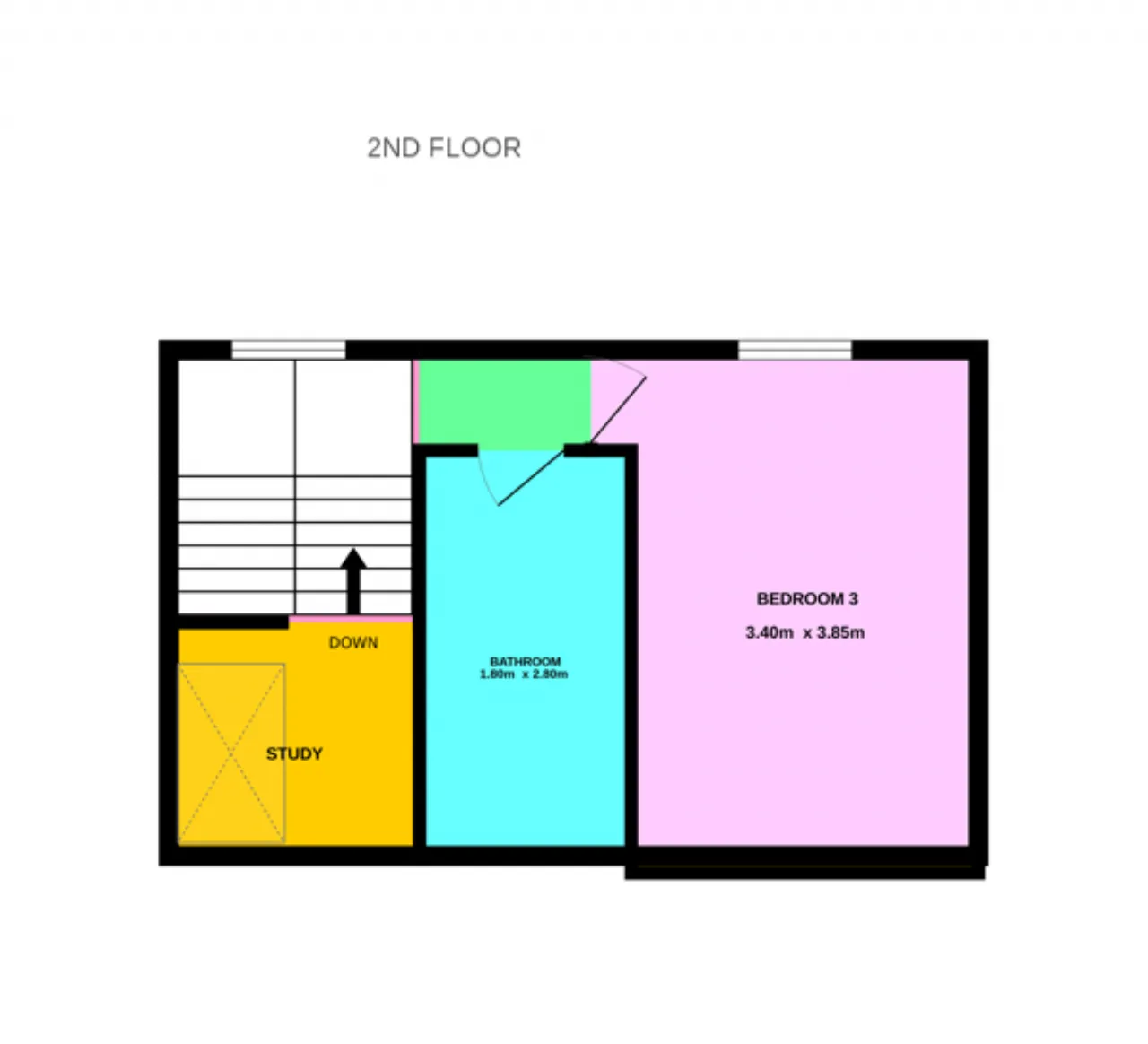 Back inside, the split level first floor incorporates two sizable double bedrooms. The impressive principal bedroom sits to front containing a 12ft high ceiling and eye-catching detailed plasterwork. Adjacent to the principal bedroom there is a contemporary shower room featuring attractive wall and floor tiles, and a his & hers sink. Climbing further, the second floor comprises another double bedroom, a modern bathroom, and a study area which is a necessity for today’s living.