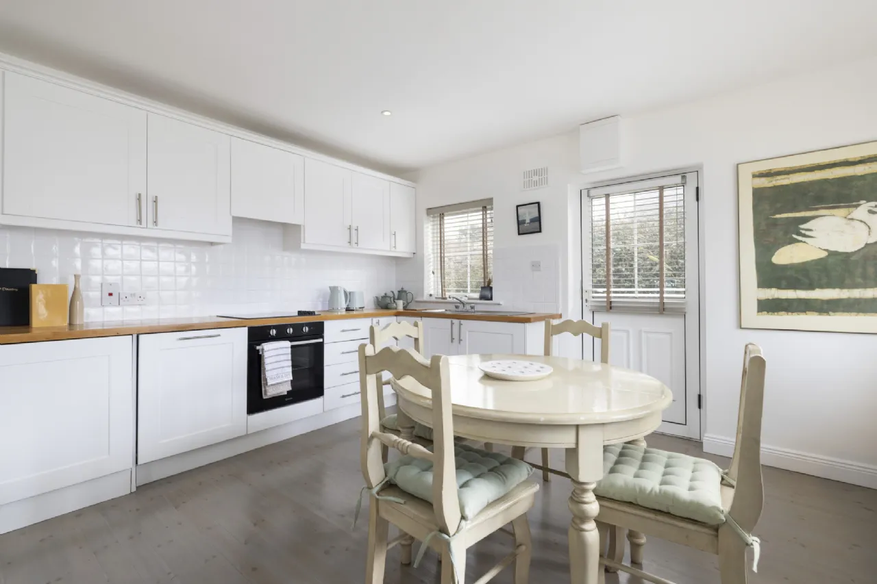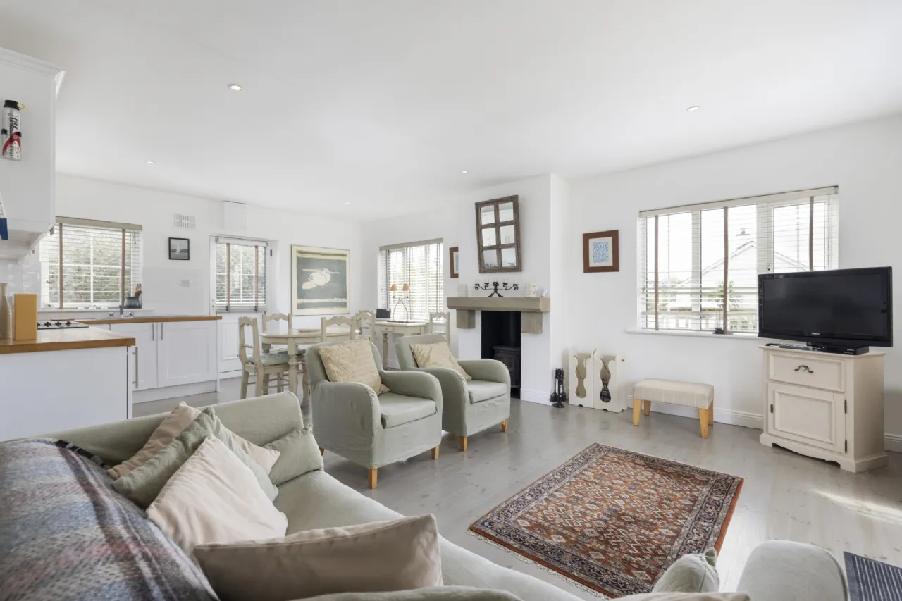 Upon entering, you are welcomed into a spacious and light-filled open-plan kitchen, dining, and living area. Designed for both relaxation and entertaining, this inviting space boasts stylish finishes, a modern kitchen with appliances, and a cosy yet sophisticated living area ideal for unwinding after a day by the sea.