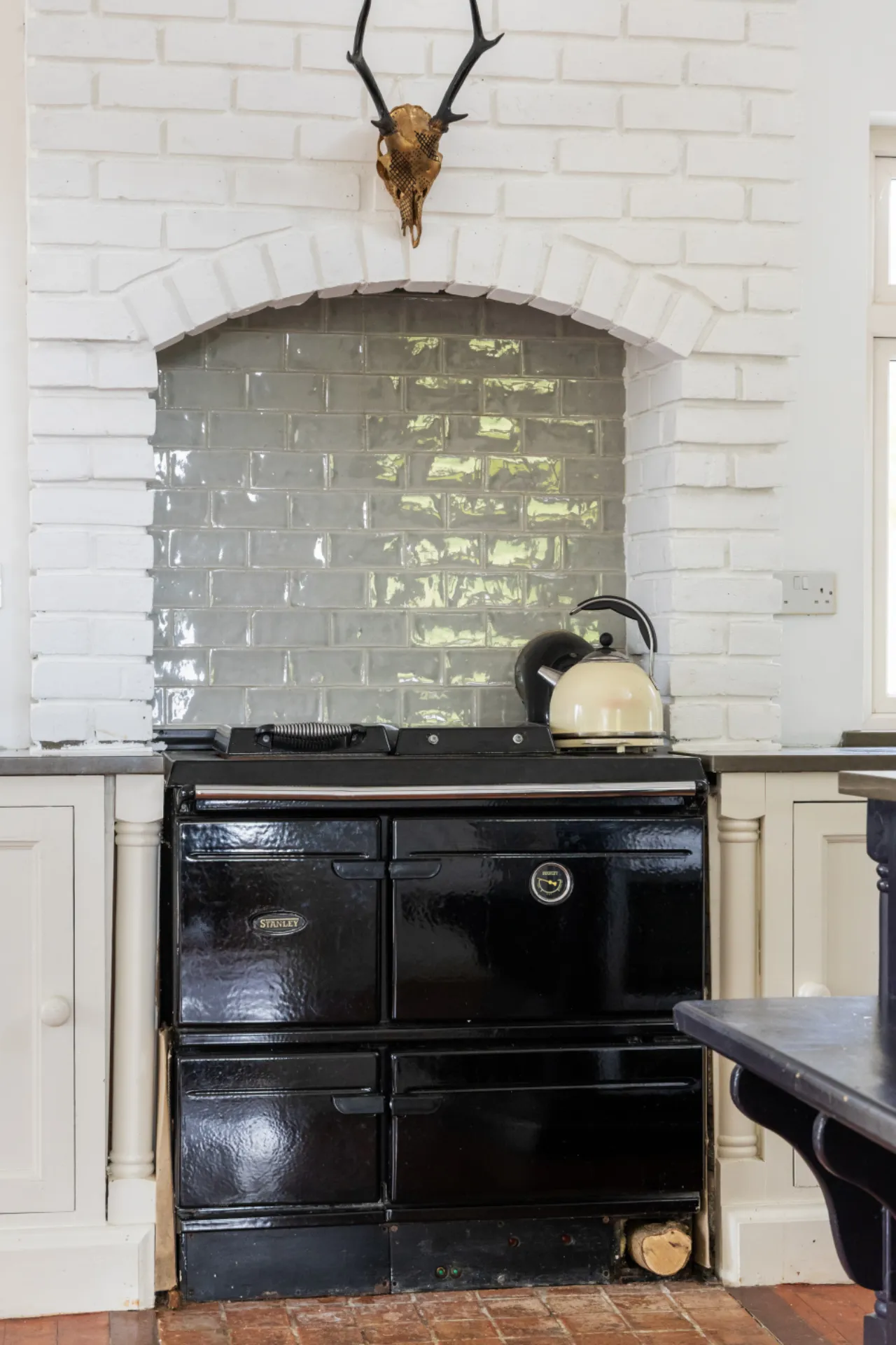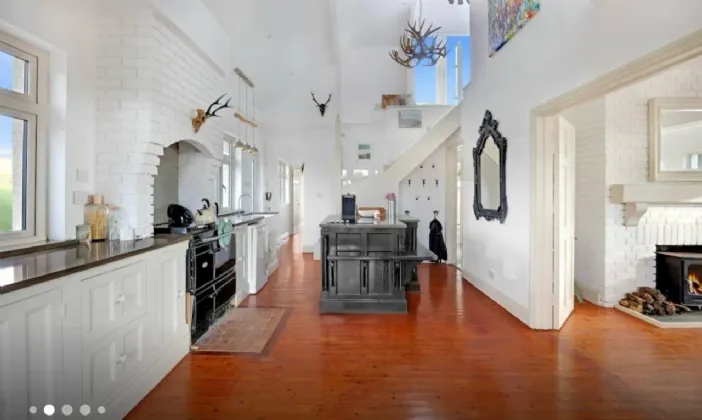 Inside, the open-plan living space is the heart of the home. A country-style kitchen is fitted with a classic Stanley range, an island with granite countertops, and a full complement of floor and eye-level units. From here, the space flows seamlessly into a striking reception room featuring floor-to-ceiling windows, a cosy wood-burning stove, and direct access to a beautiful decked terrace – the perfect spot to unwind with views over the gardens and sea beyond.