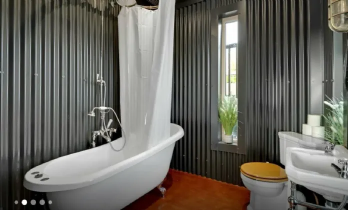 En-Suite This recently remodeled en-suite oozes character and style, with a funky, industrial-chic design. Corrugated metal walls and ceiling add a bold, edgy touch, giving the space a unique and contemporary feel. A freestanding bath takes centre stage, offering a perfect spot to relax, complemented by a sleek wash hand basin and modern WC. It’s a vibrant, one-of-a-kind space that combines function with fearless design flair.