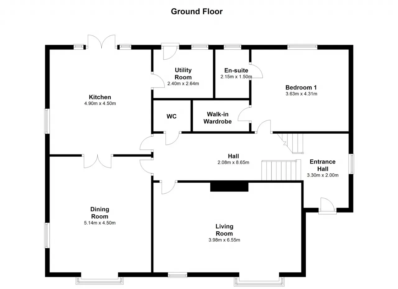 Drawing Room Bright and spacious drawing room with oak flooring, polished stone fireplace with gas fire and high ceilings. Bay windows with views to garden and forest beyond.