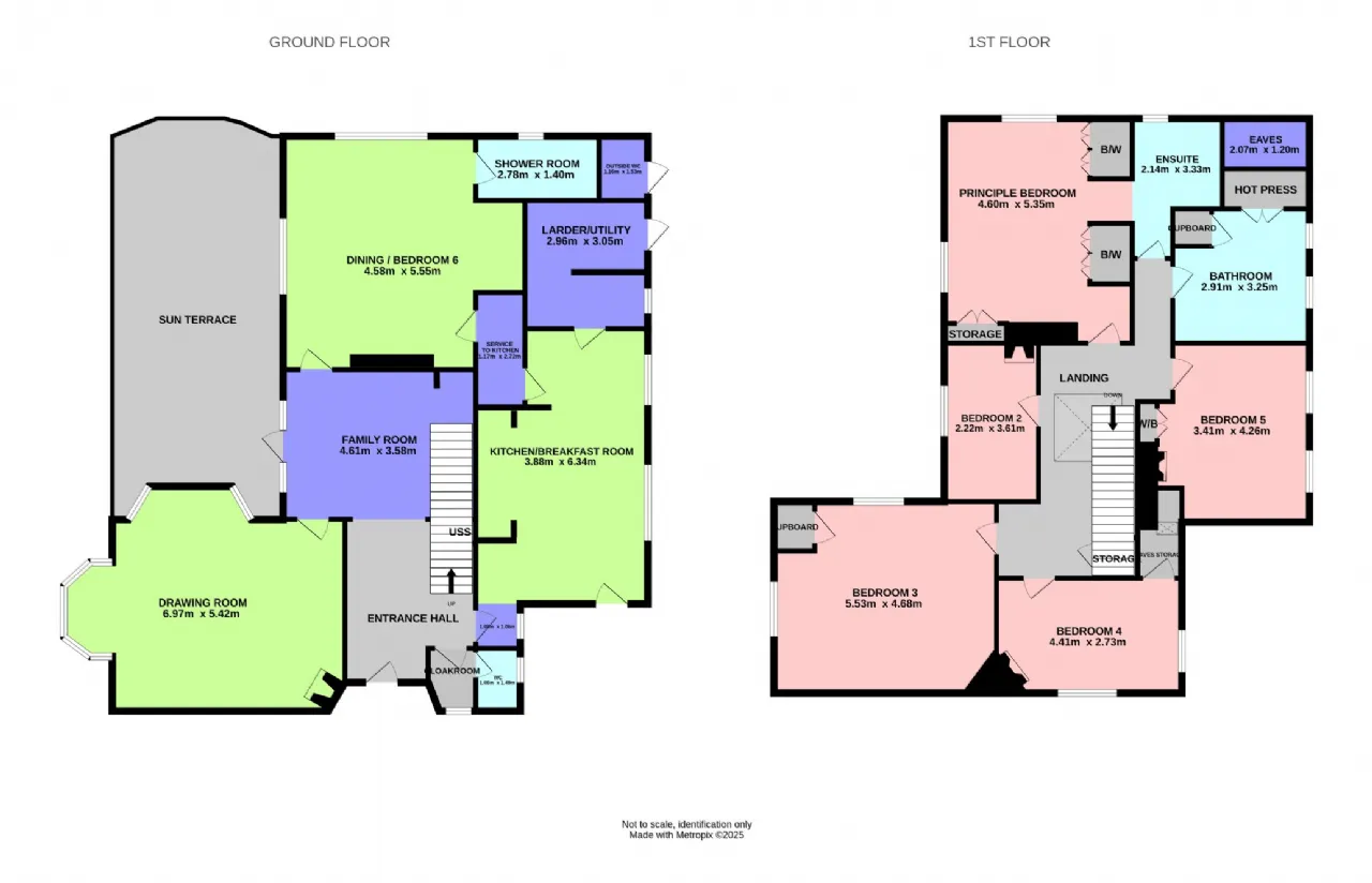 The spacious accommodation spanning approximately 260.8 sq.m (2,807 sq.ft), briefly includes an entrance hall leading to a family room with access to a sun terrace, bay windowed dual aspect living room, formal dining room which has been reconfigured into a downstairs bedroom (6) with shower room en suite, kitchen breakfast room and utility