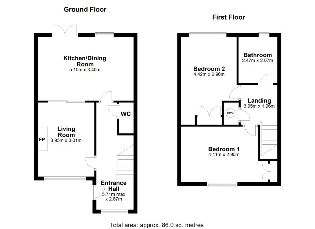 Bathroom 2.47m x 2.07m Fully tiled to walls and floor with bath, electric shower, wc and whb.