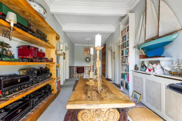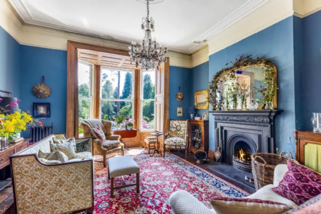 The drawing room is very elegant, with its intricate cornicing and a large cast-iron period fireplace serving as a focal point. The sitting room is a cosy retreat, perfect for relaxed evenings, with charming period details and large windows framing views of the surrounding gardens. The dining room is grand in scale, ideal for hosting formal dinners, with ample space for a large dining table.