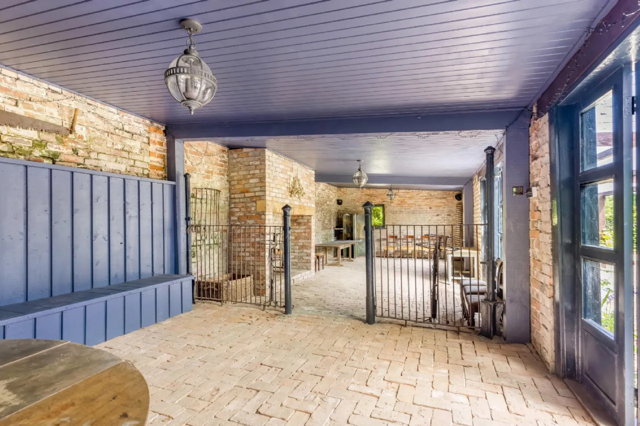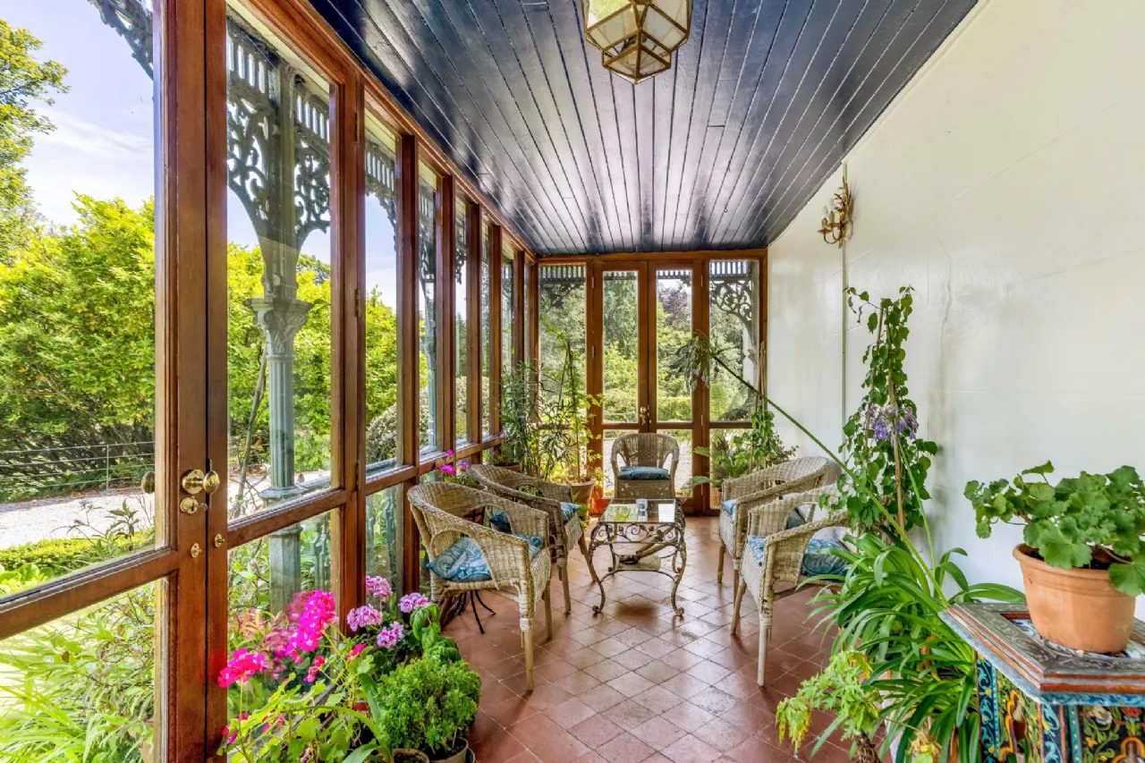 The conservatory, A sunlit haven for relaxation and plant appreciation Is perfect for enjoying the sun throughout the day. It opens onto an ornate pergola draped in seasonal blooms, extending the living space outdoors and offering a picturesque spot for alfresco dining or evening relaxation.