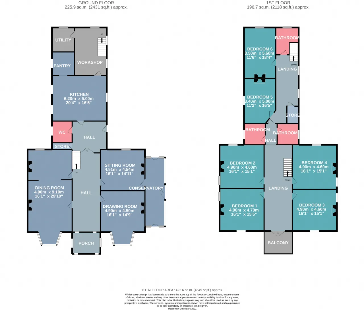 The first floor is accessed via a wide staircase and comprises six generously proportioned bedrooms, thoughtfully arranged to provide both privacy and comfort.