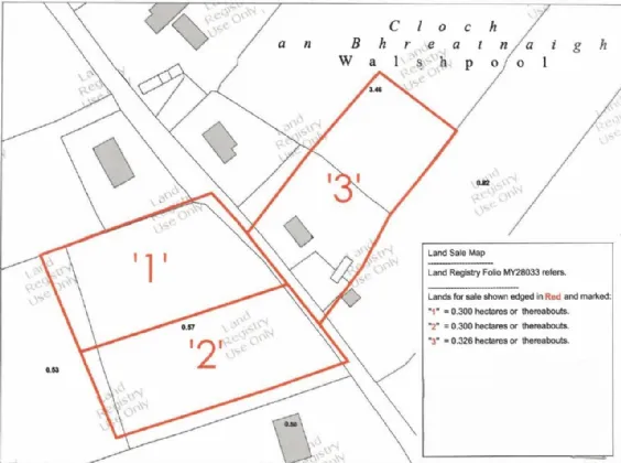 This residential site of approximately 0.326ha/0.81 acres is being sold subject to planning permission. The land is part of folio MY28033. There is an old shed on this land.