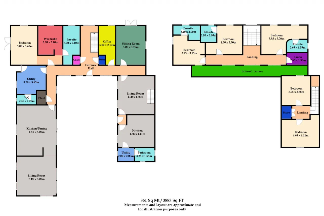The main residence includes entrance hall, spacious living room, open-plan kitchen / dining area, utility room, guest WC, and a ground floor bedroom complete with a walk-in wardrobe and ensuite. Additional ground floor spaces include a private office and a family room. Upstairs, the layout comprises three further bedrooms, each with its own ensuite, offering comfort and privacy for family and guests alike.