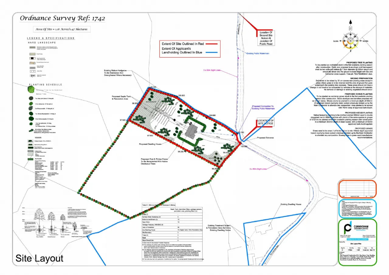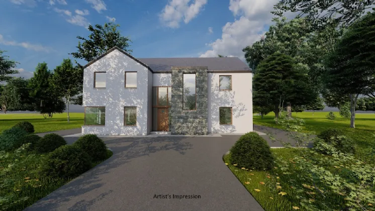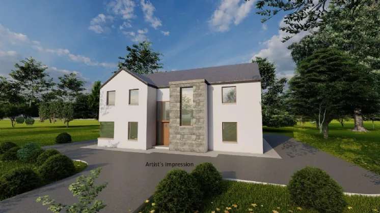 Planning permission for the construction of a two-storey dwelling house, boundary wall or fencing, septic tank and percolation system, along with ancillary works. Proposed accommodation comprises entrance hallway, open-plan kitchen/dining room, living room, utility, WC, four bedrooms (1 en-suite), study, and large attic space, with external patio and landscaping.