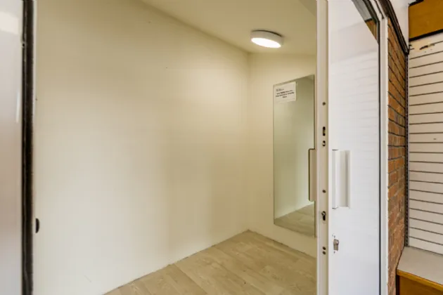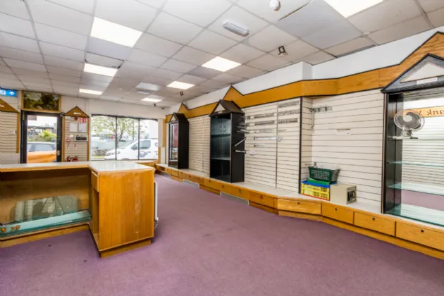 The unit has a wide street frontage with large windows offering natural light and display space. Internally, the layout is open-plan, giving flexibility for fit-out depending on the intended use.