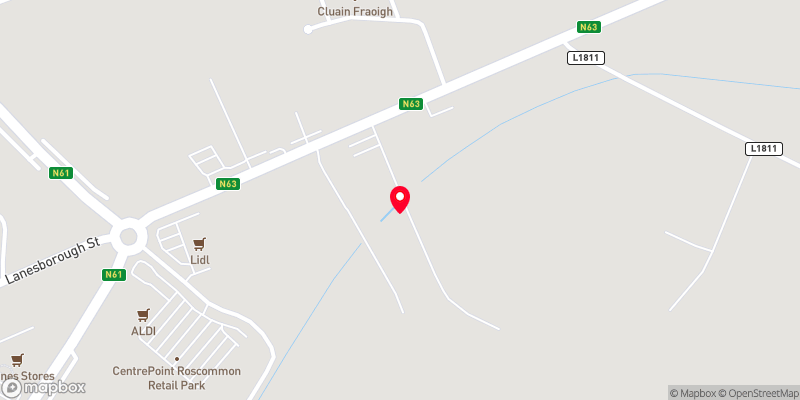 Roscommon (Irish: Ros Comáin) is near the meeting of the N60, N61 and N63 roads, putting it roughly in the centre of Ireland. Despite the town itself having a relatively small population, it caters to about half the population of County Roscommon. Loughnaneane Park is situated in the town centre. It contains a children's playground, outdoor exercise equipment, a lakeside walkway, picnic tables, and Roscommon Castle. Other amenities include Roscommon Golf Club, Dr. Hyde Park, and Roscommon Racecourse. Roscommon Leisure Centre opened early 2002 and has a 25 m (82 ft) deck level pool with a learner swimming pool and spectator gallery and fully equipped gymnasium.